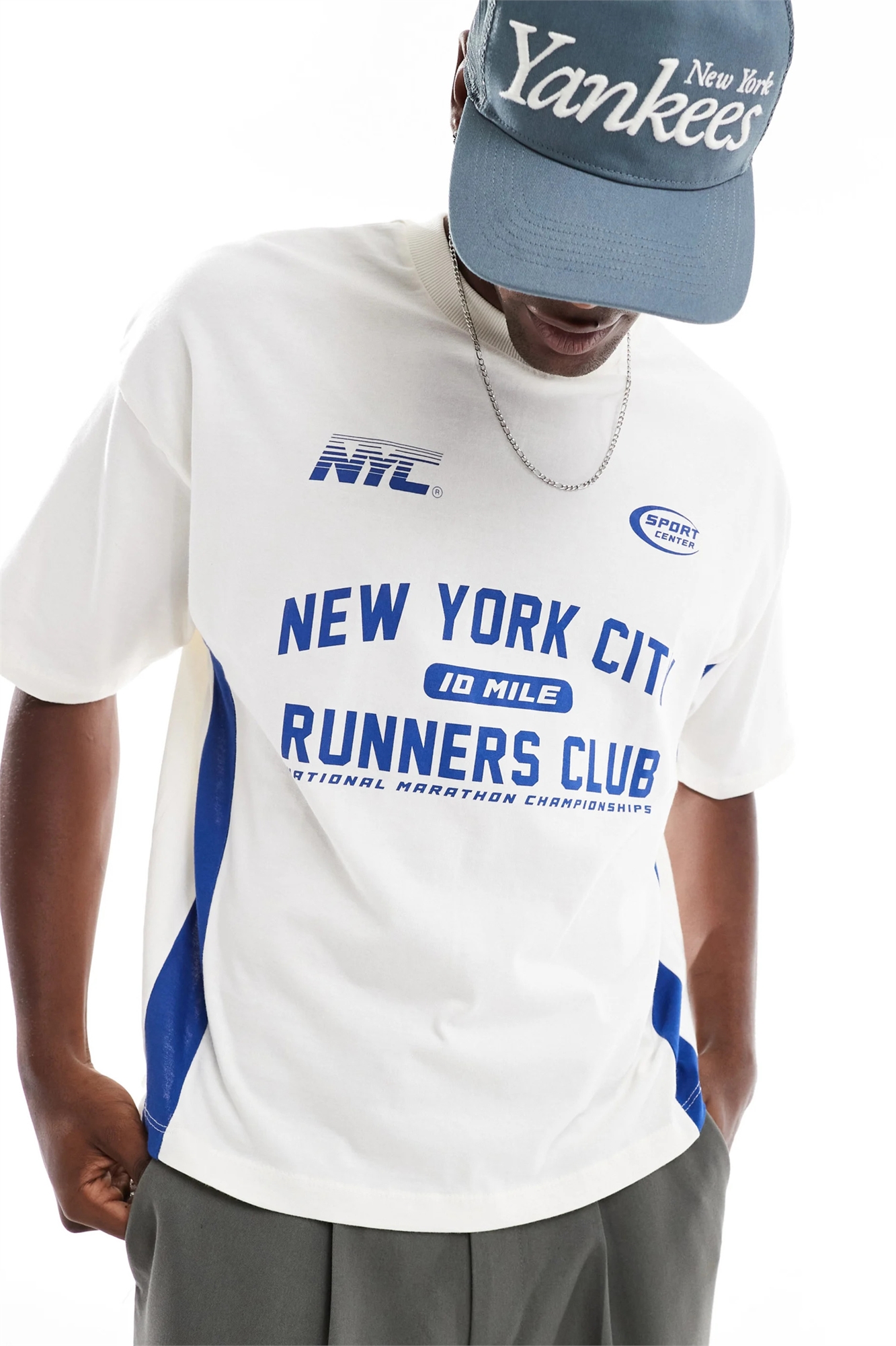 Объёмная футболка свободного кроя с вставками из другого материала и спортивной графикой