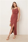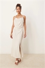 Платье средней длины из льна с закрученными плечами и рюшами