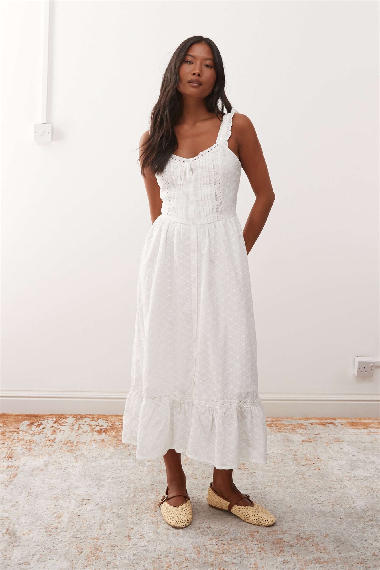 Бродерия: легкая ткань с вышитым вырезанным узором. Вышивка: 100% хлопок, подкладка: 100% хлопок, верх: 100% хлопок.