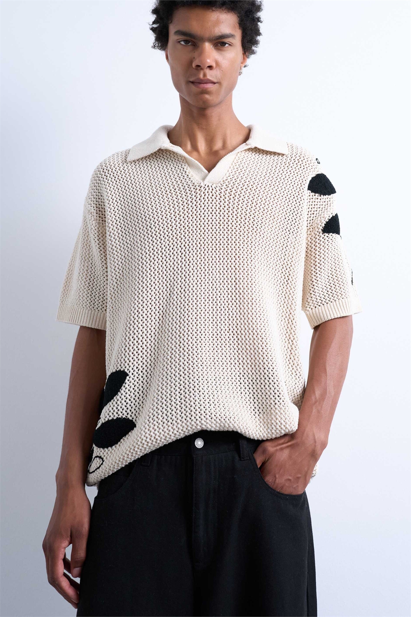 Полуприталенная поло-рубашка с воротником-ревер, связанная крючком, с цветочной вышивкой на корпусе и рукавах