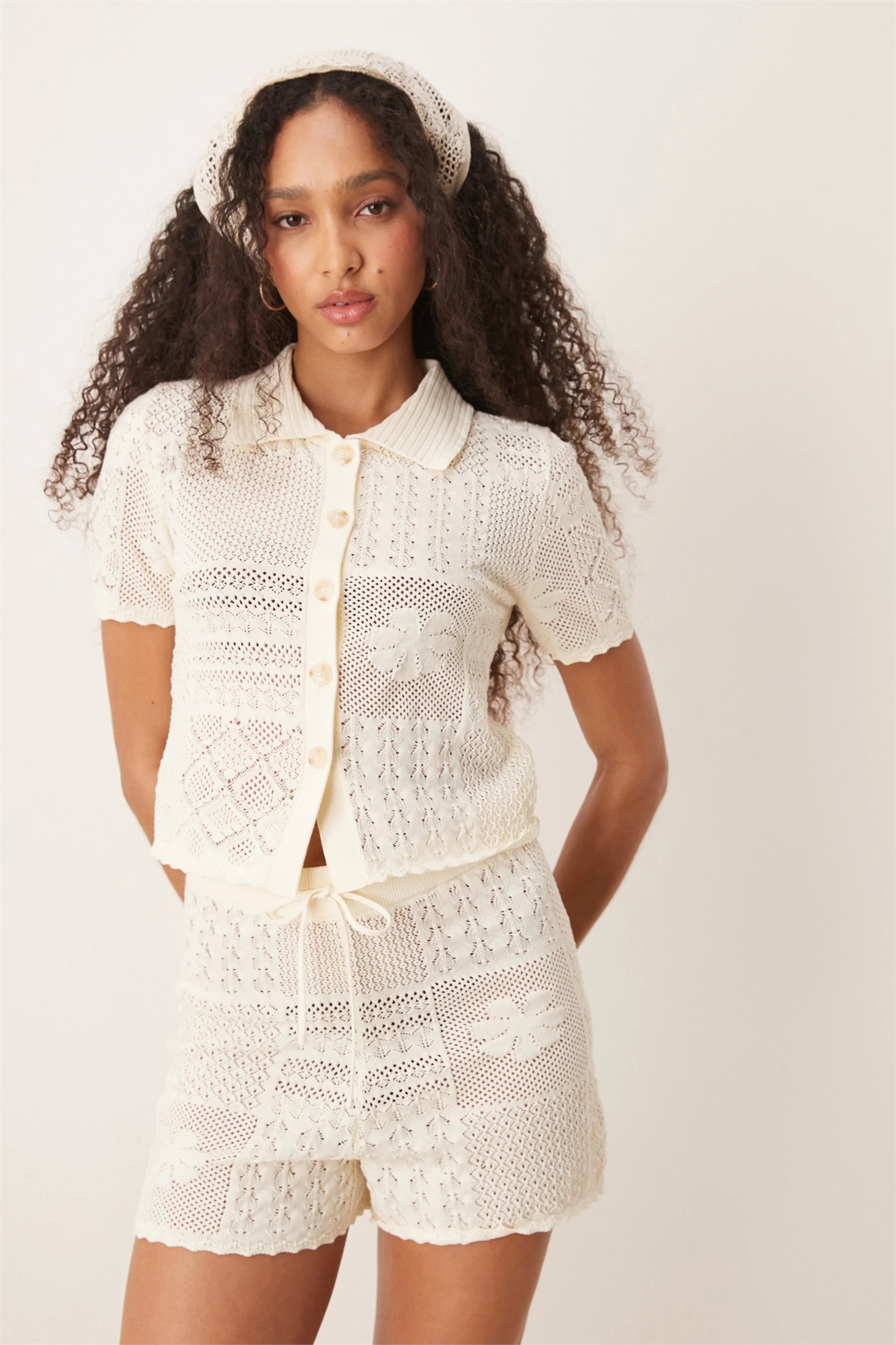 Вязание крючком: вязаное, ажурное, фактурное полотно с узором, имитирующим ручную работу. Основной материал: 100% хлопок.