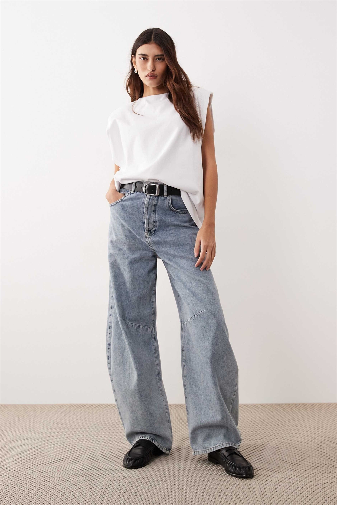 Тяжелый, неэластичный деним: светло-голубой оттенок Основной материал: 100% хлопок.