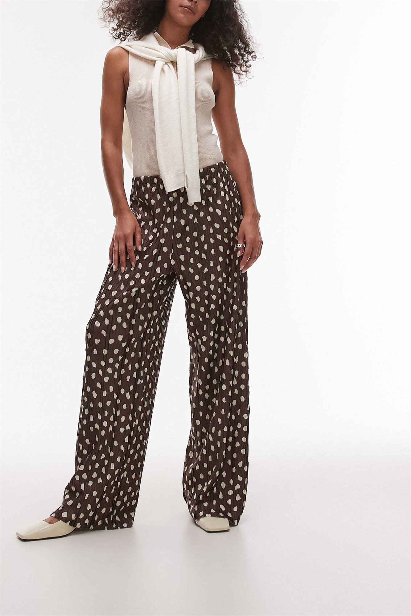 Брюки с широкими брючинами в горошек и плиссировкой