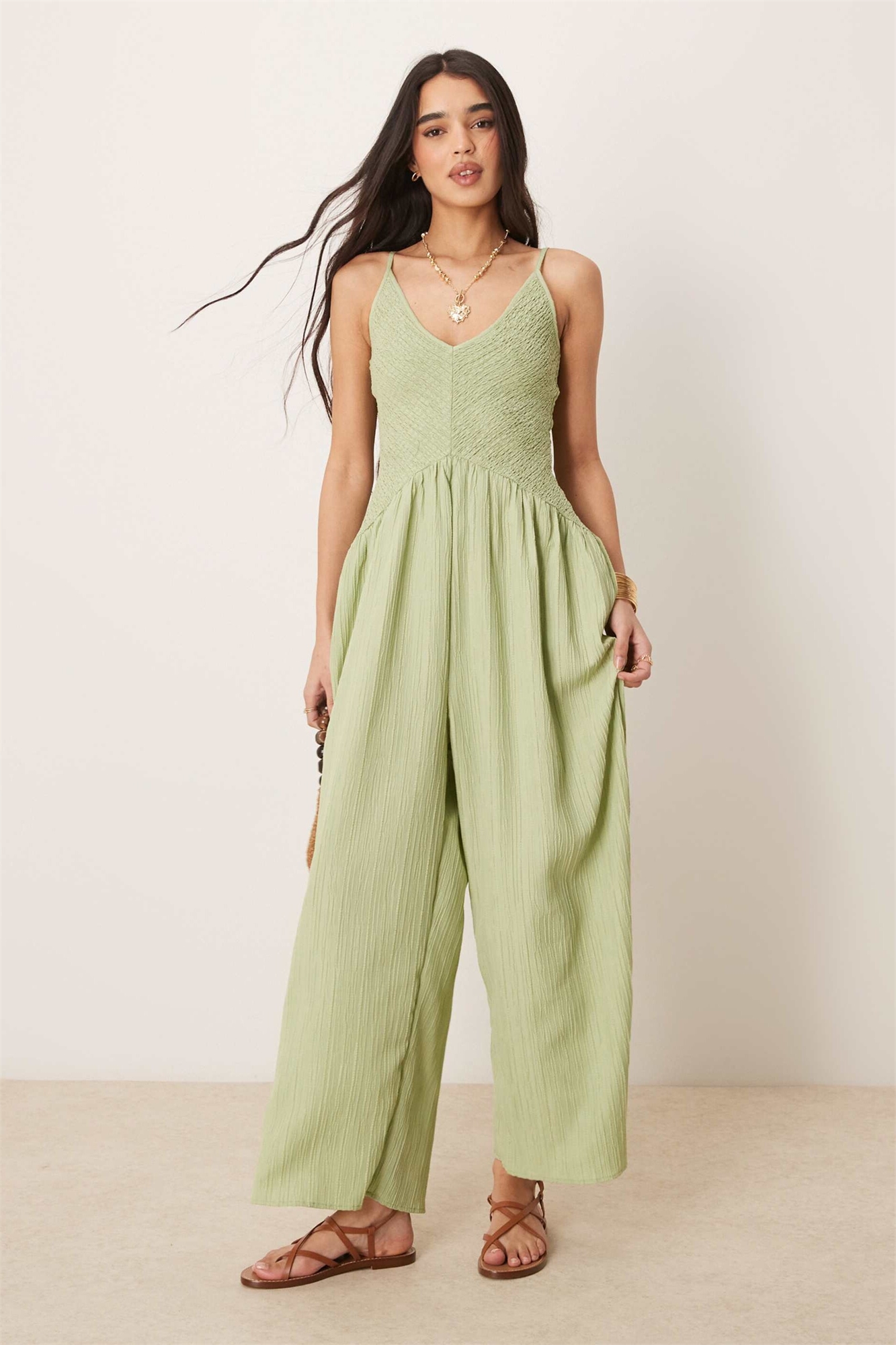 Комбинезон с V-образным вырезом из полиэстера с эффектом гофрированной ткани и заниженной талией