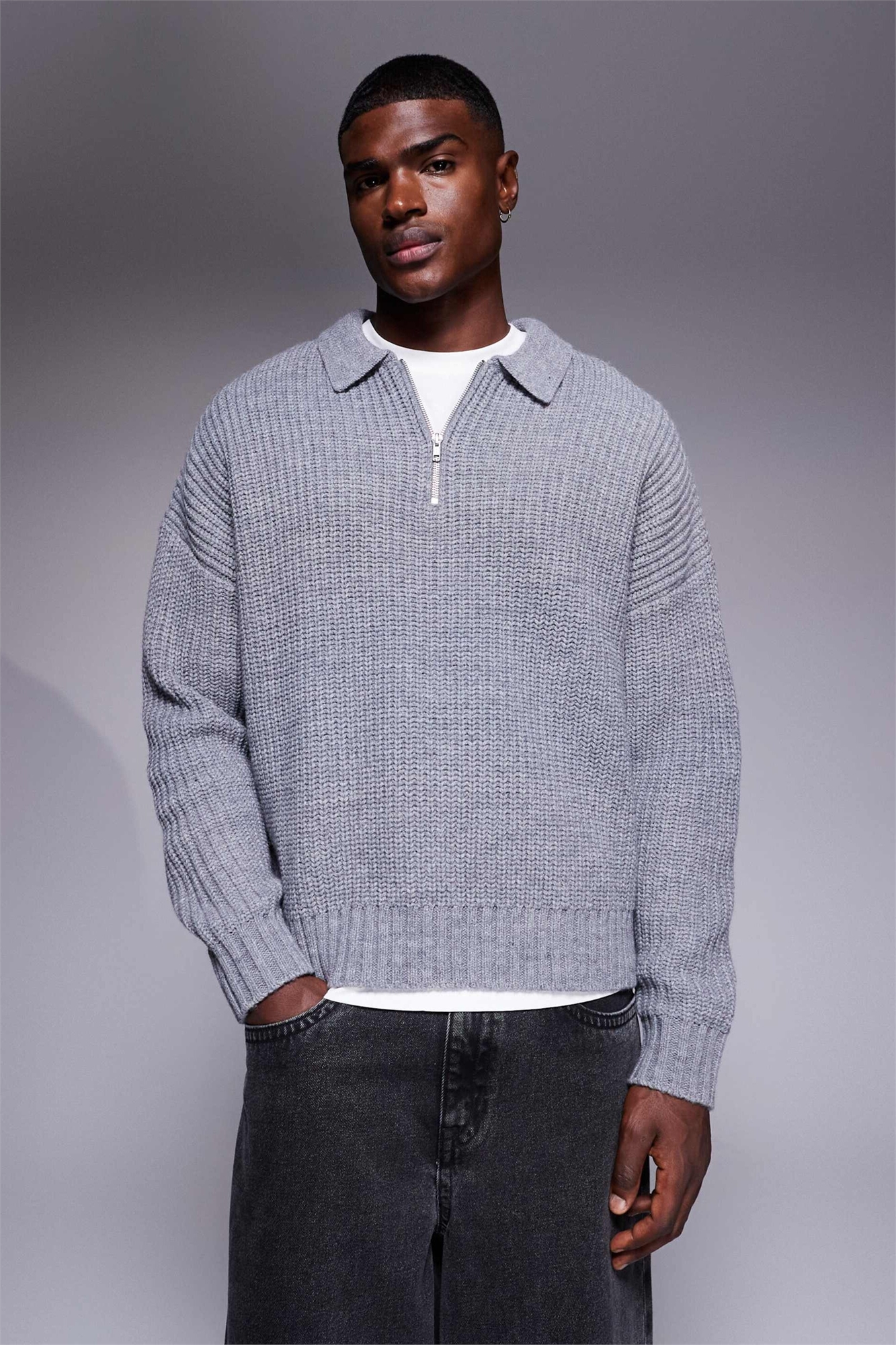 Свободный крой, тяжелая трикотажная смесовая шерсть, четверть-молния, поло, серый меланж