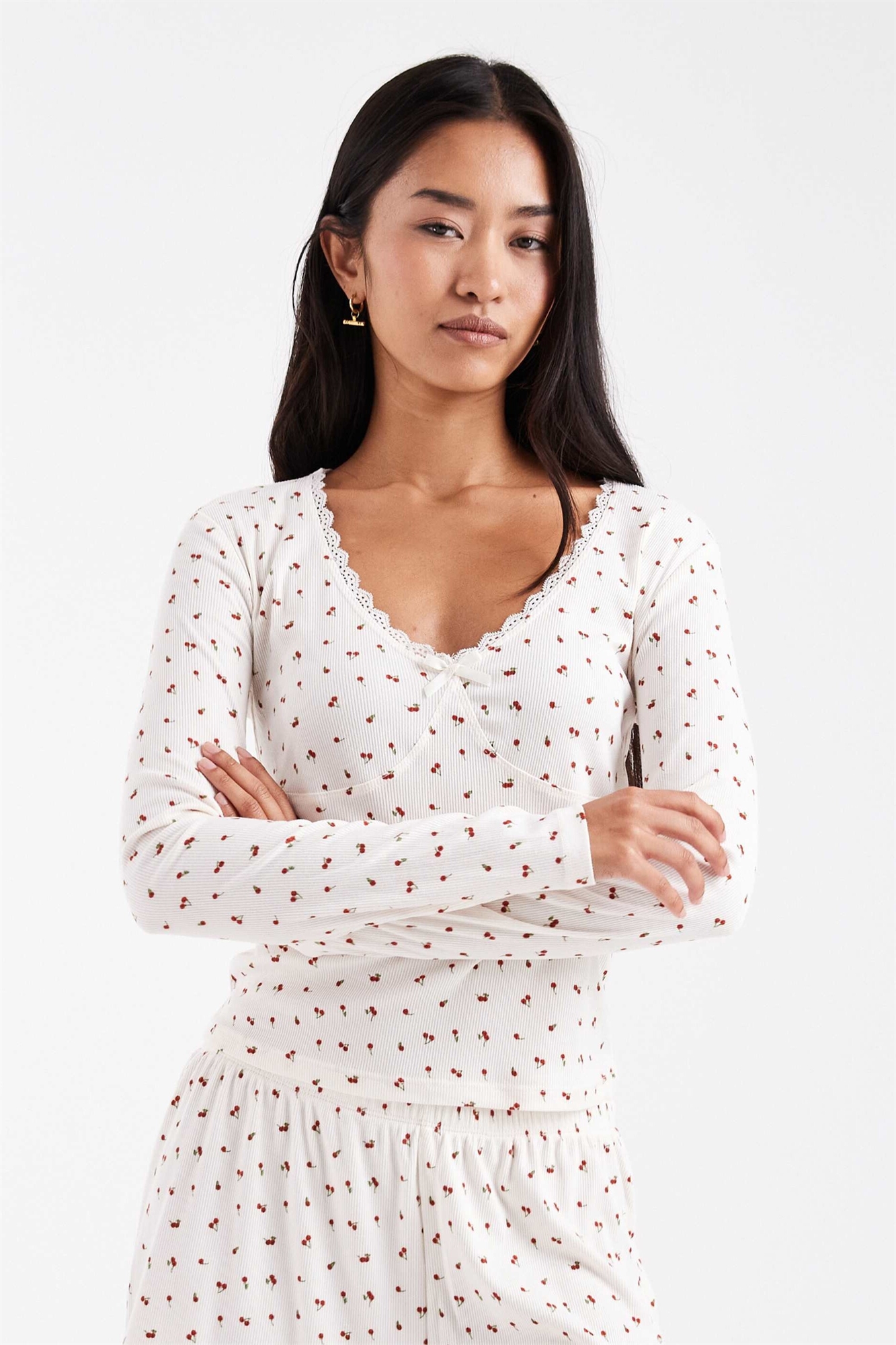 Пижамная кофта с длинными рукавами и ребристым швом с вишневым принтом