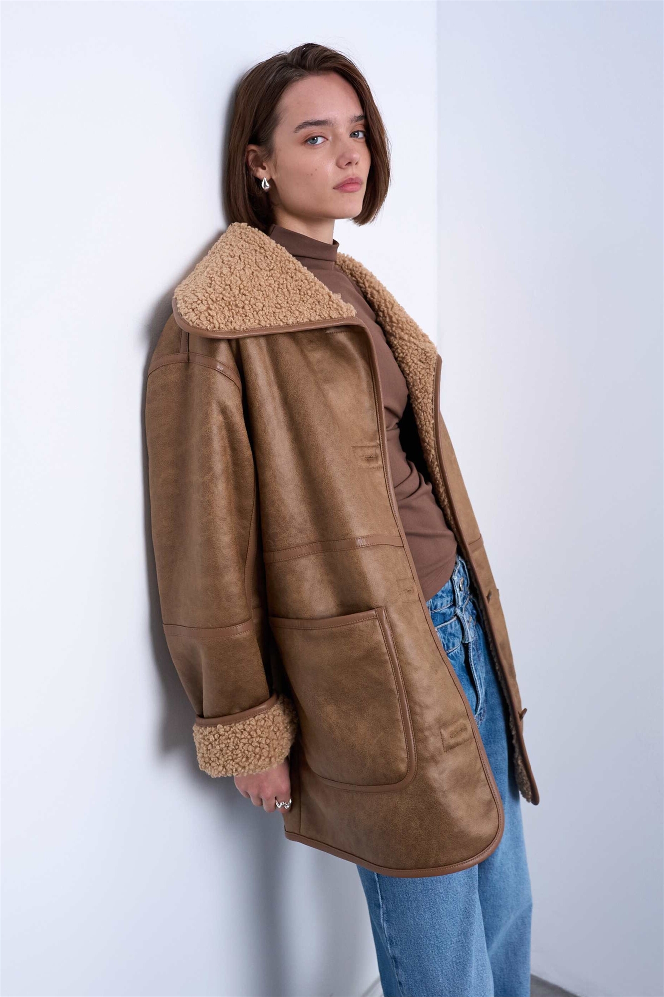 Пальто средней длины из овчины с объемными накладными карманами