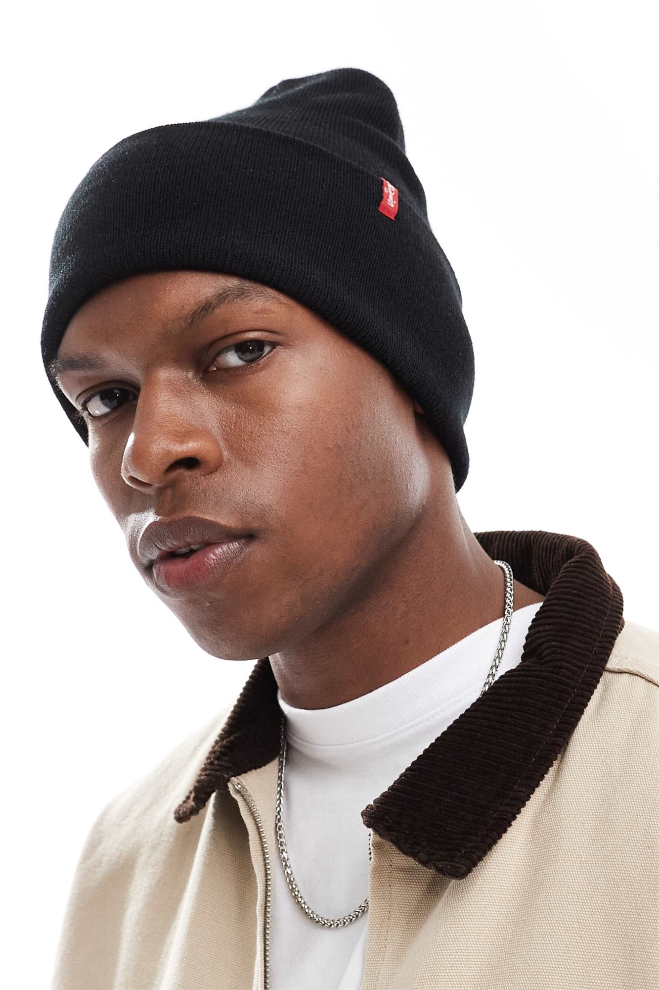 Вязаная шапка свободного кроя с красной тесьмой