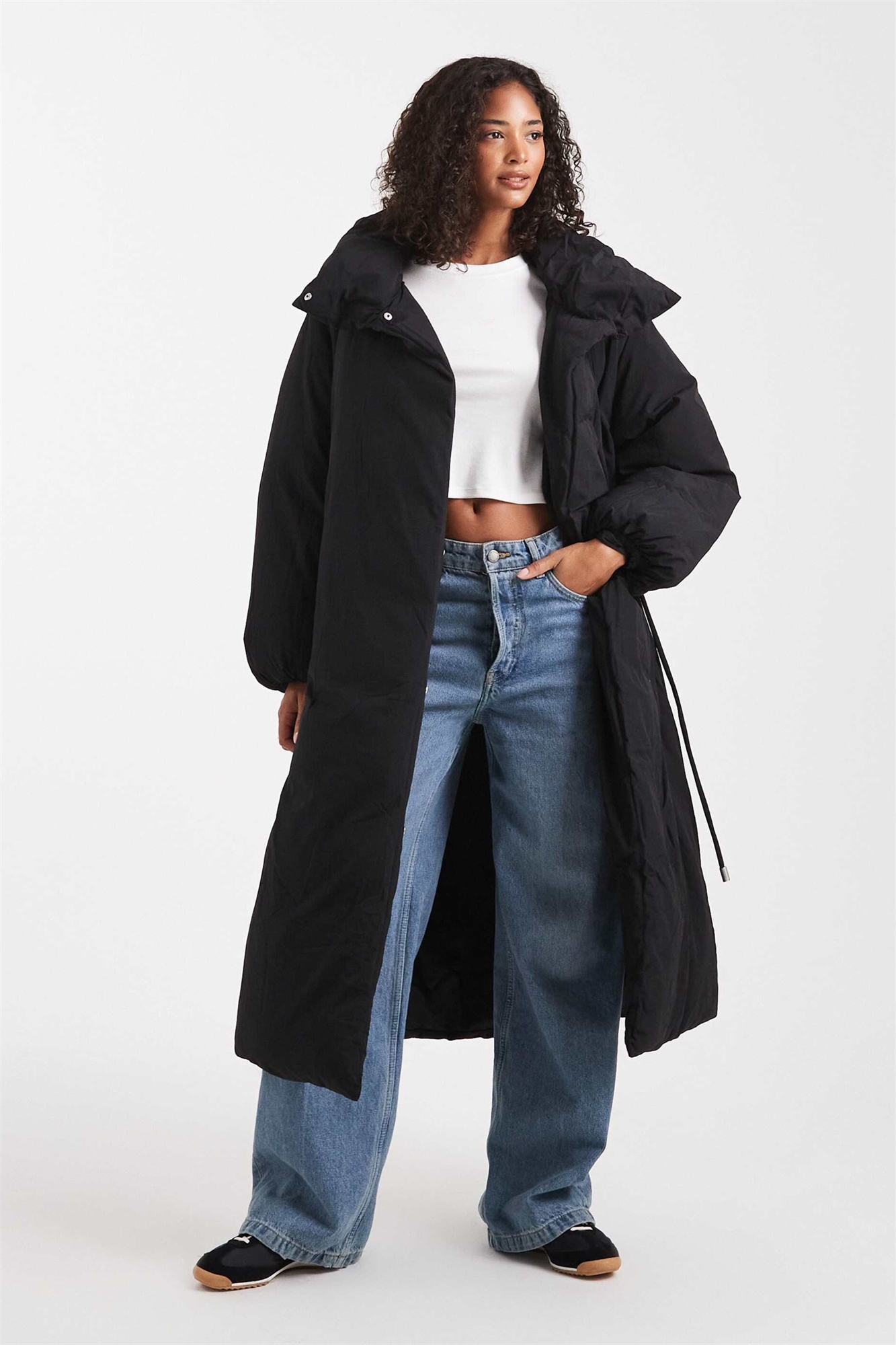 Пуховик с удлиненным кроем и воротником-воронкой