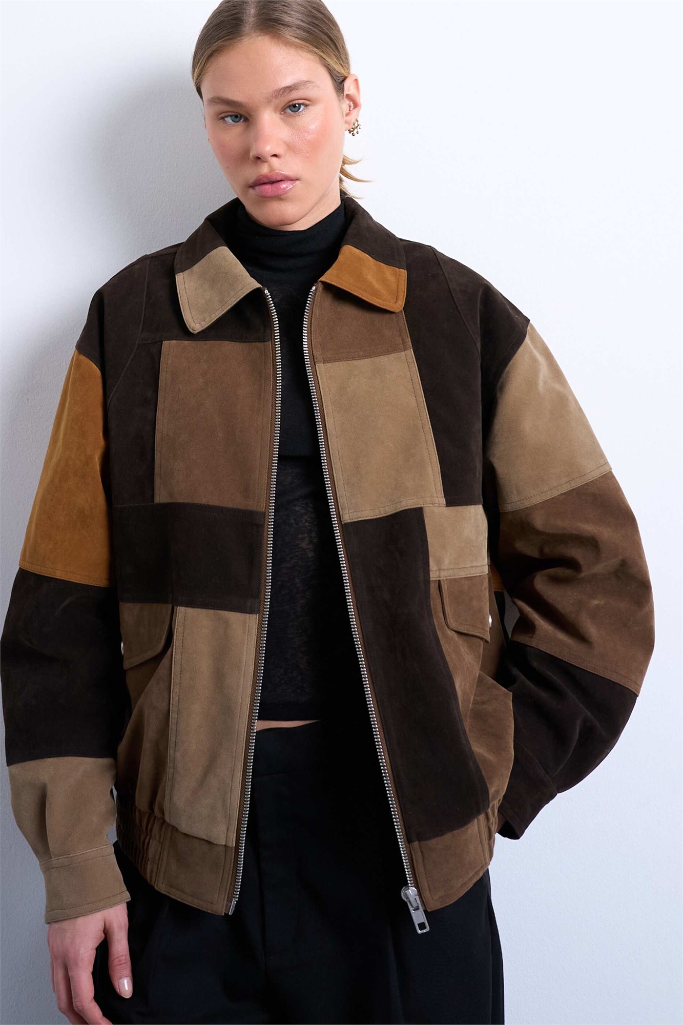 Бомбер из искусственной замши в стиле «пэчворк»