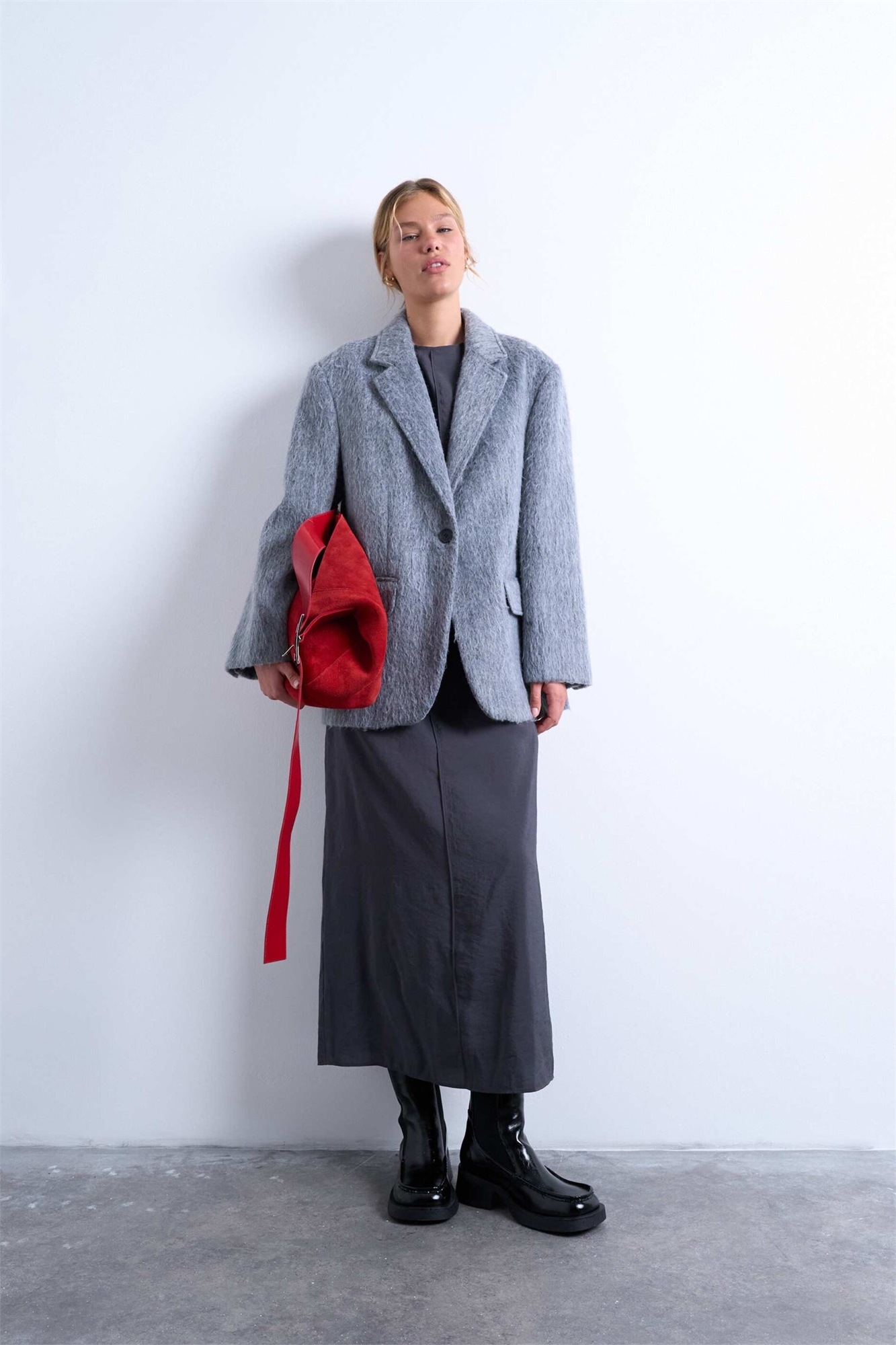 Длинное пальто-блейзер из шерсти с ворсовой отделкой и одной пуговицей