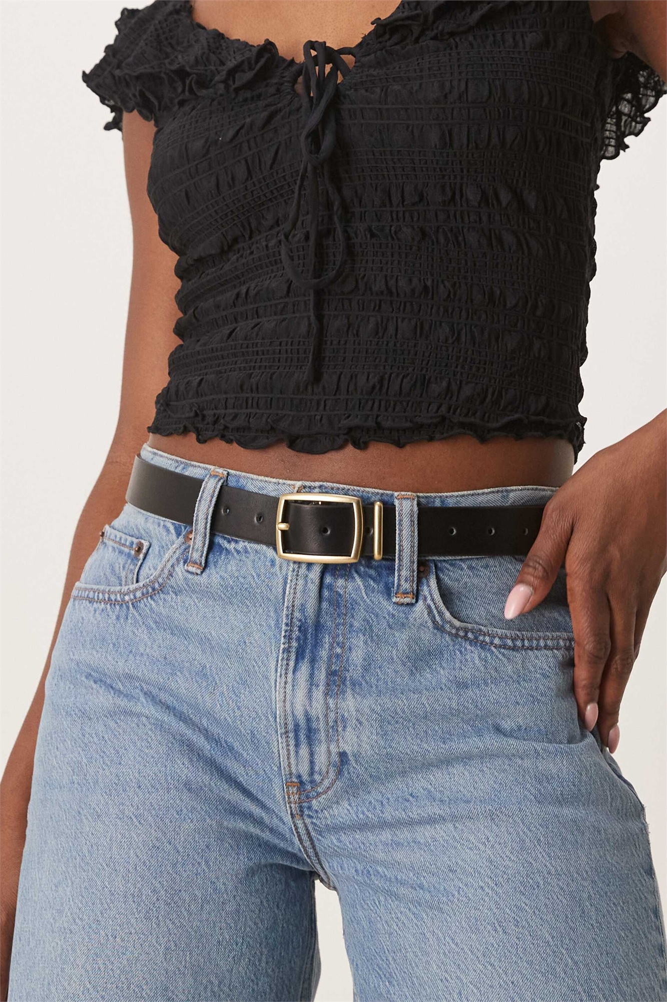 Джинсовый ремень с квадратной пряжкой на талии и бедрах