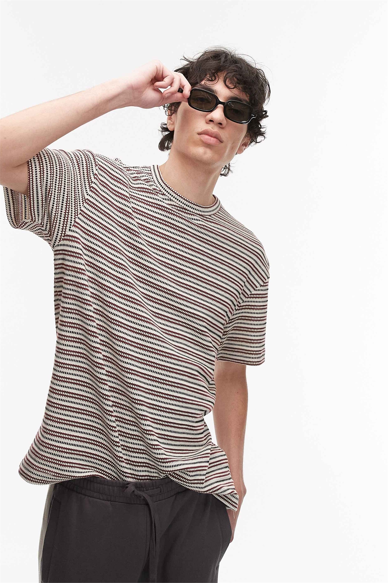 Футболка свободного кроя с вязаной полоской темно-красного цвета