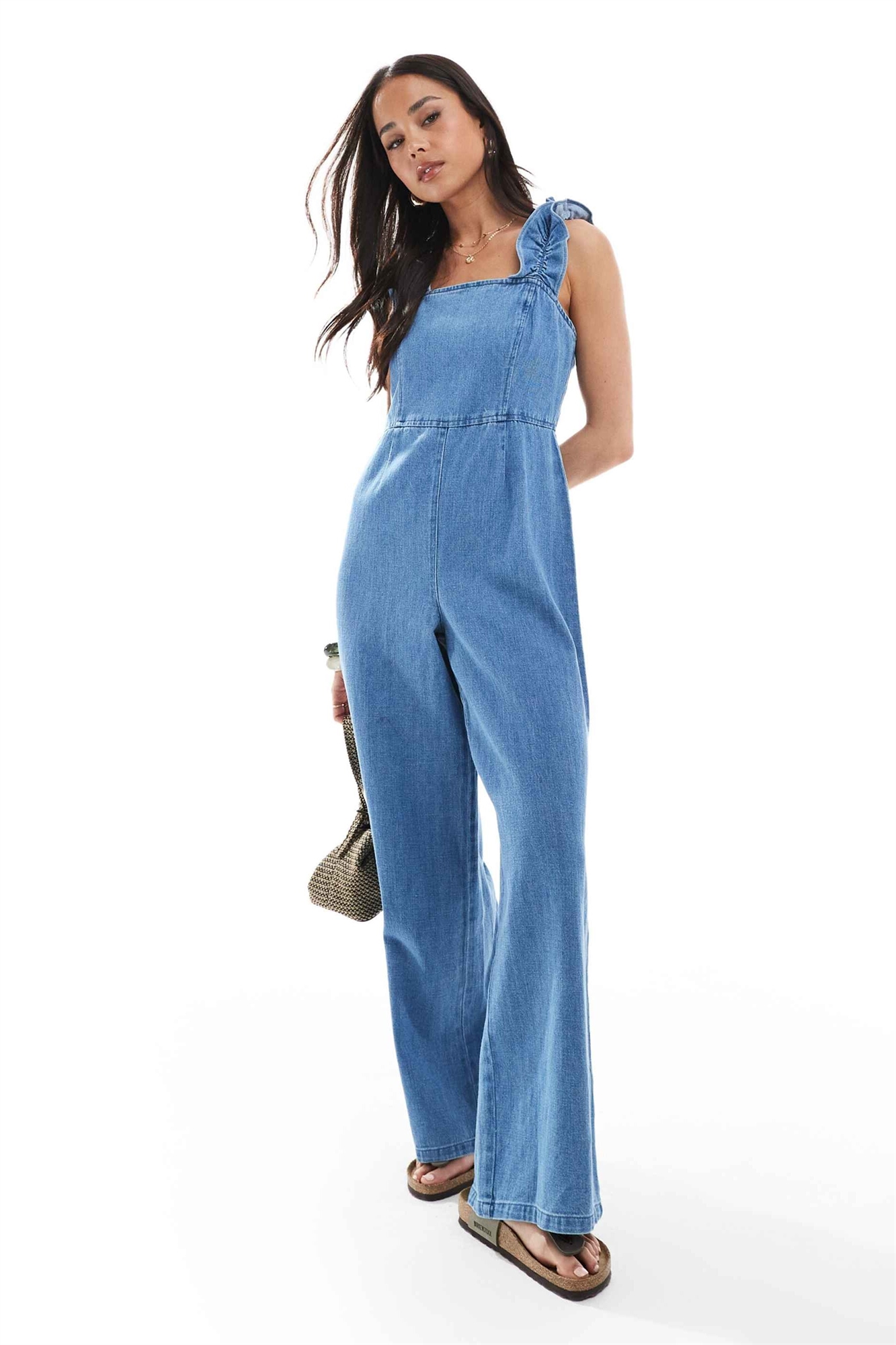Мягкий джинсовый комбинезон с бретелями с оборками