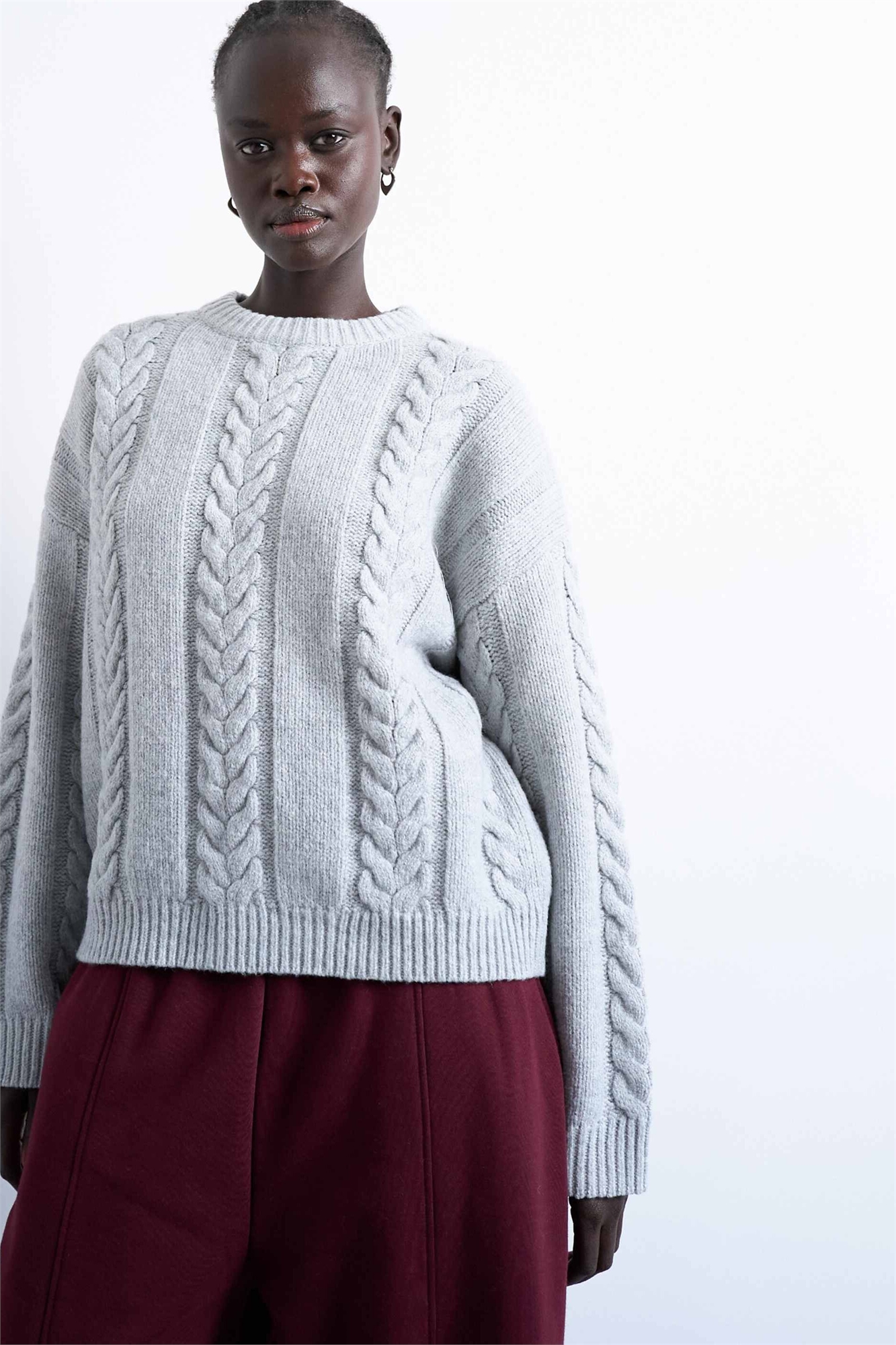 Свитер свободного кроя с косами и широкой резинкой