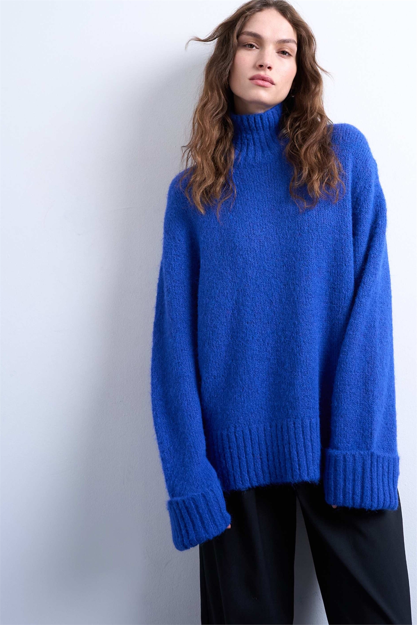 Длинный свитер оверсайз из трикотажа с воротником-воронкой и декором на горловине