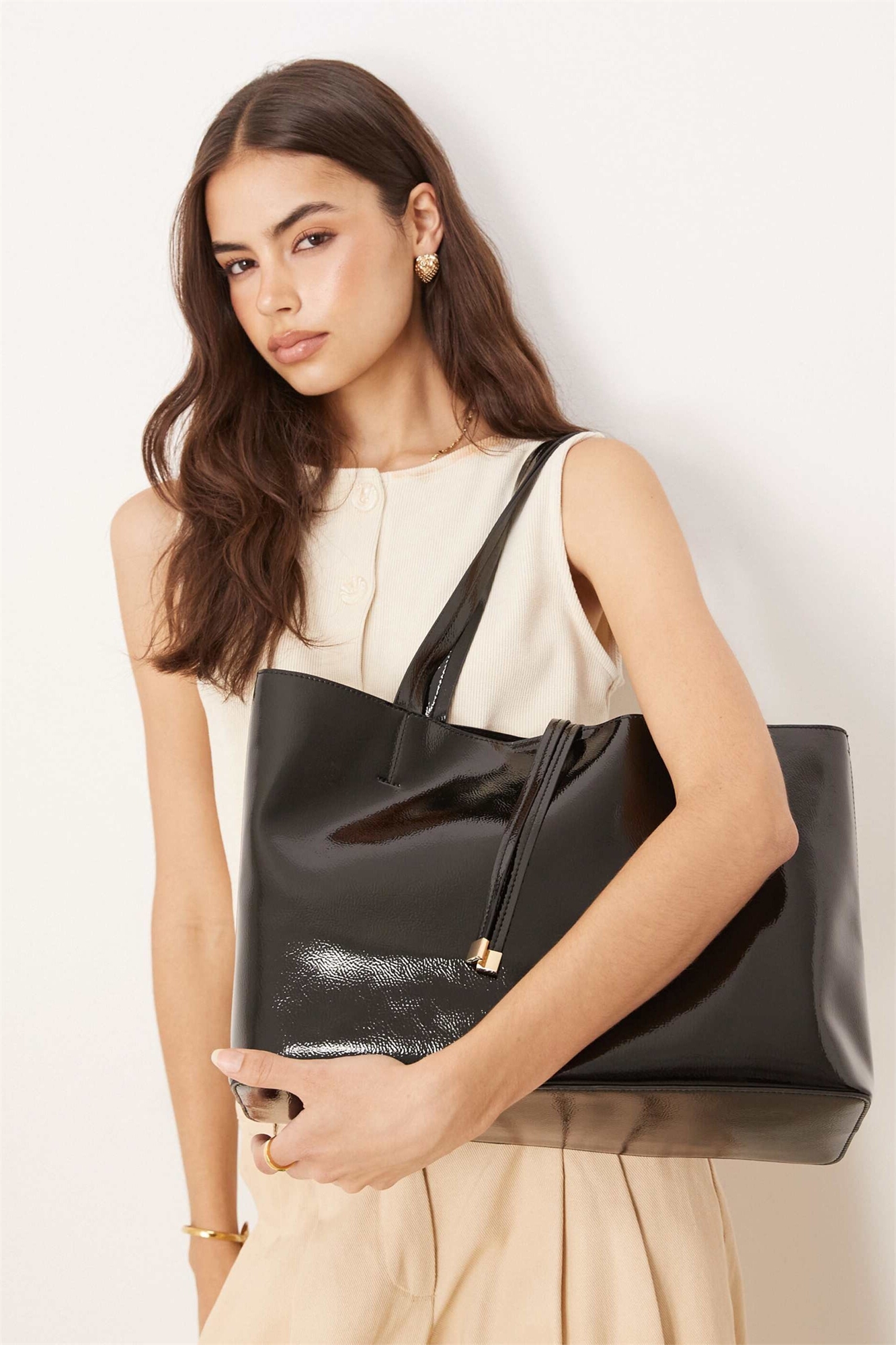 Глянцевая, лакированная отделка. Подкладка: 100% полиэстер.