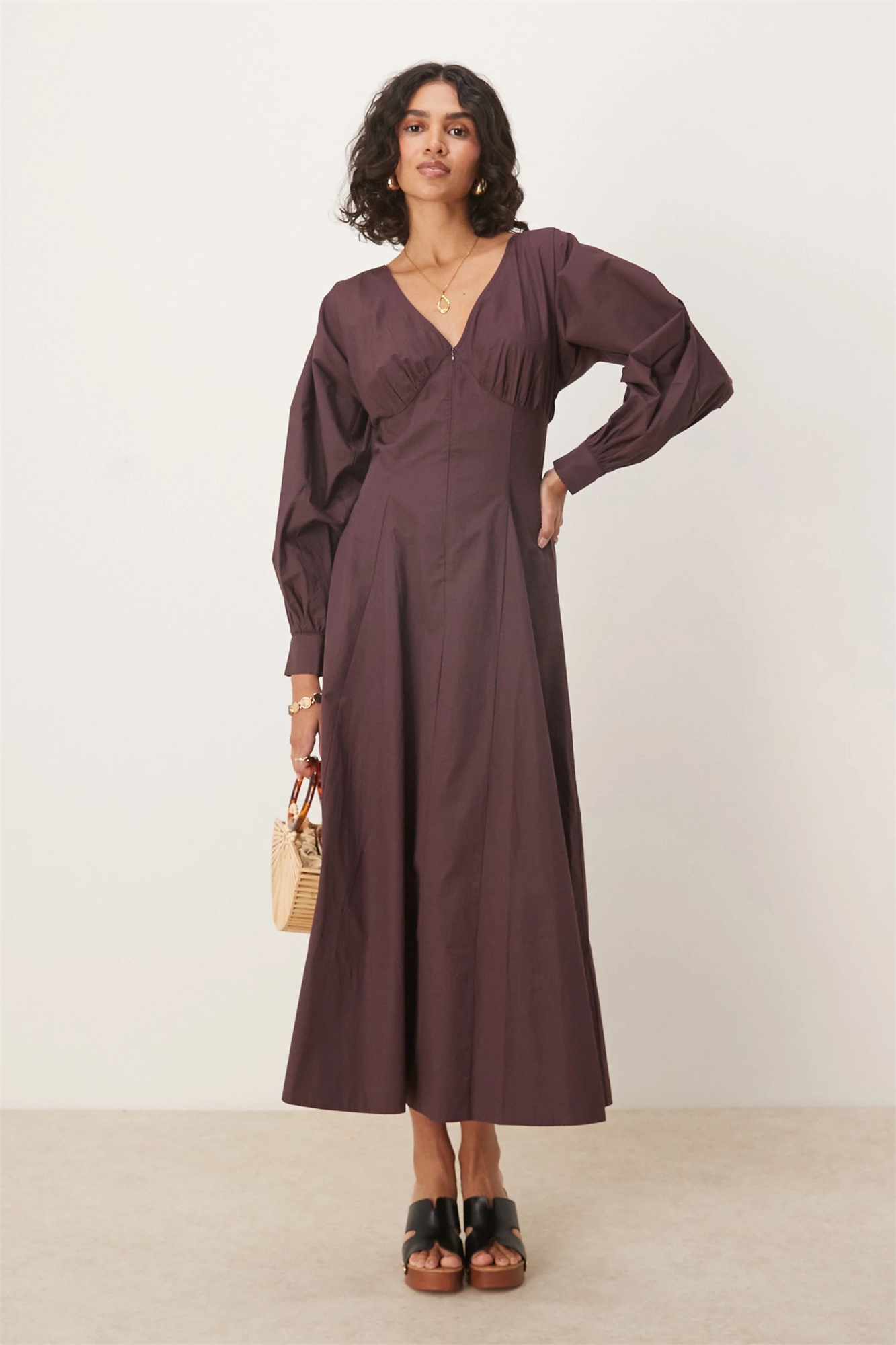 Макси-платье из поплина с длинными рукавами и V-образным вырезом