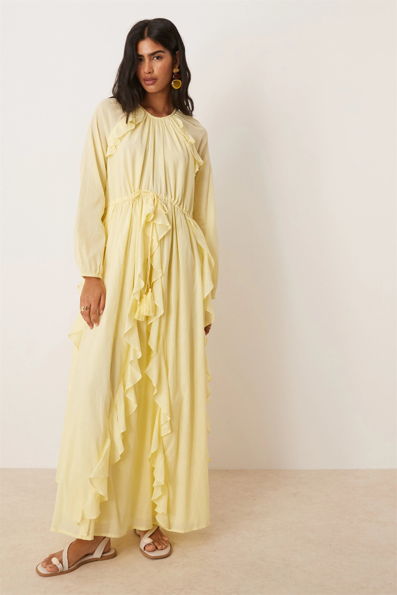 Макси-платье с круглым вырезом, сборками на талии и оборками