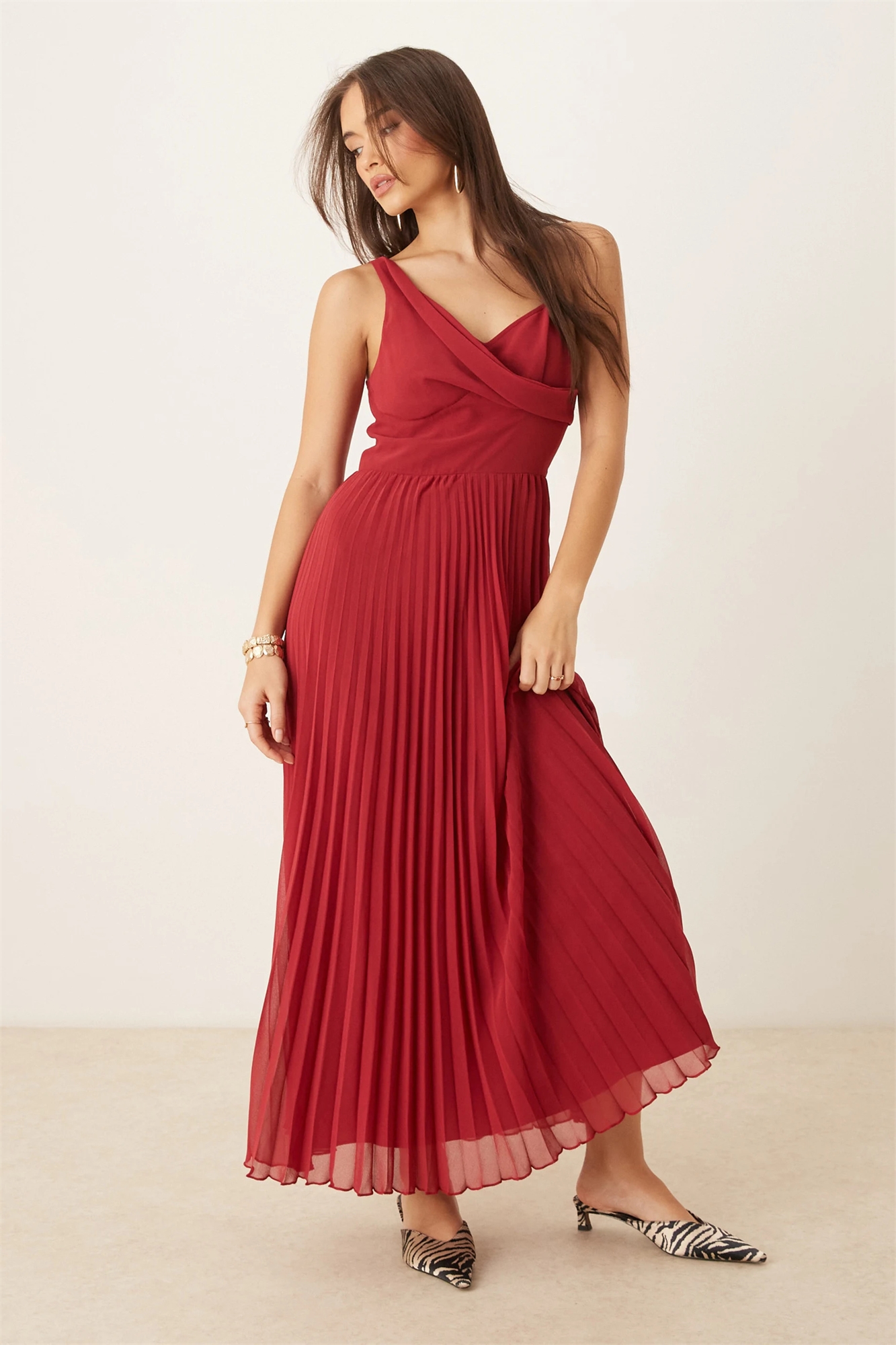 Платье средней длины с драпированным лифом и плиссировкой