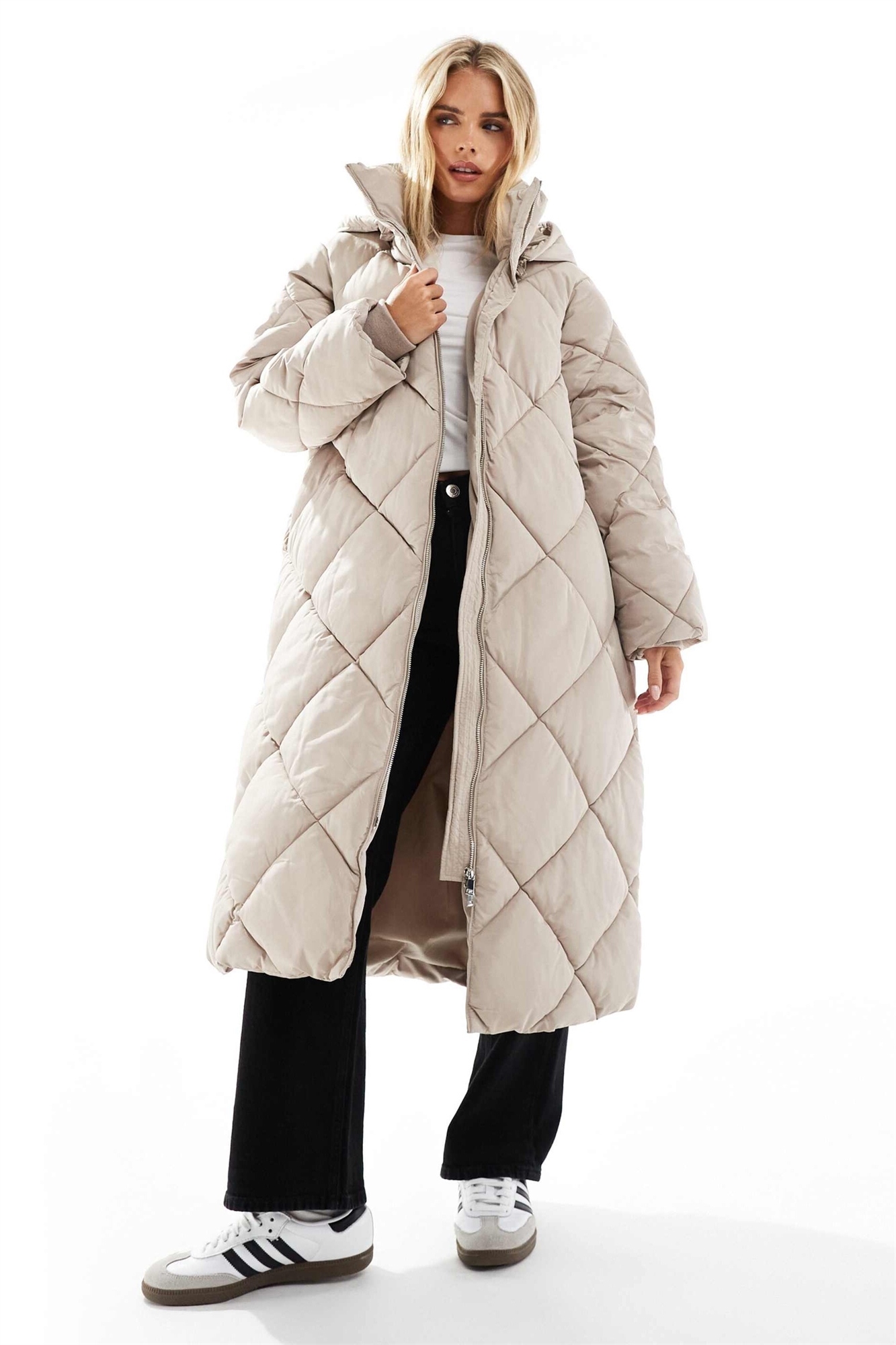 Стеганое пальто-пуховик макси с капюшоном