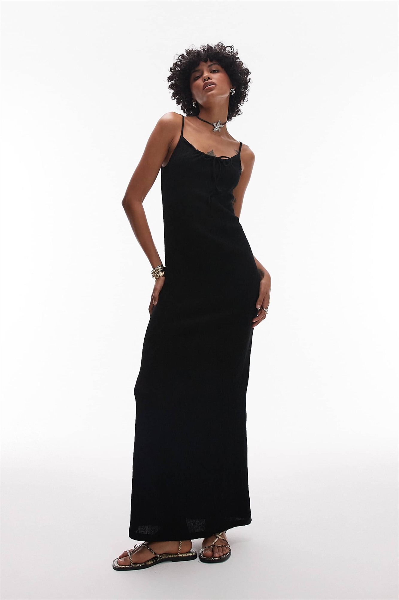 Макси-платье-камизолька с рюшами и завязками спереди