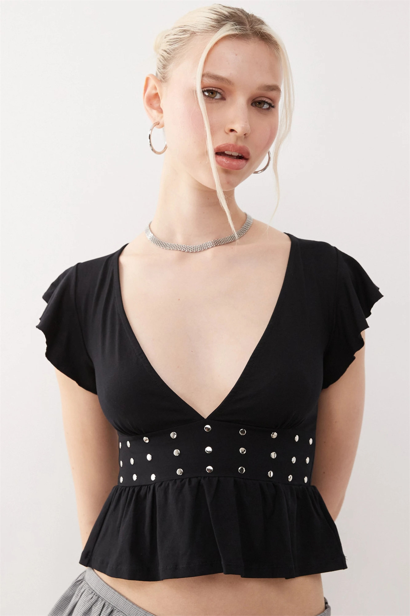 Топ с глубоким вырезом, оборками на рукавах и заклепками от Leisma