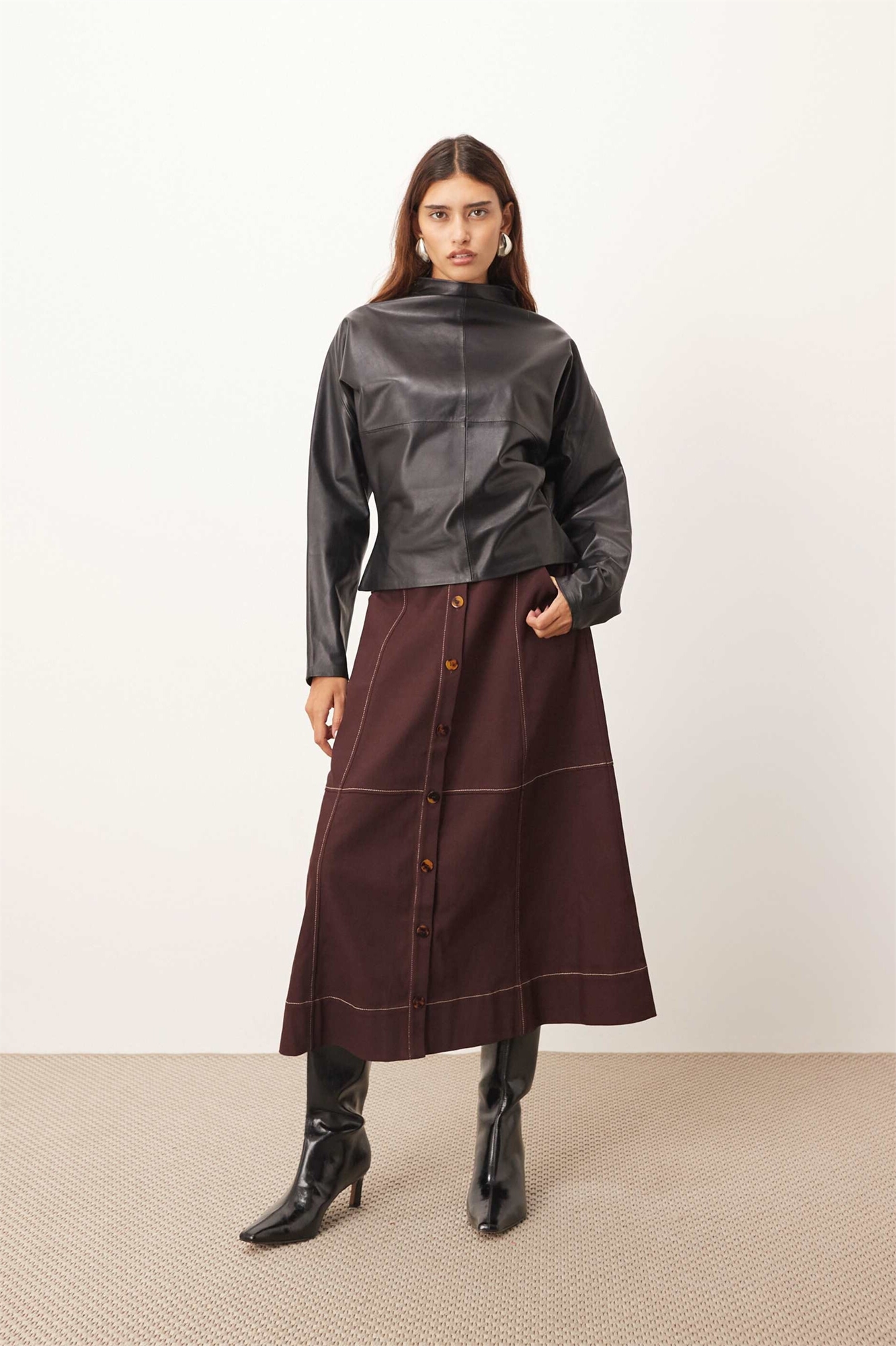 Плотная юбка средней длины из твила с контрастной строчкой