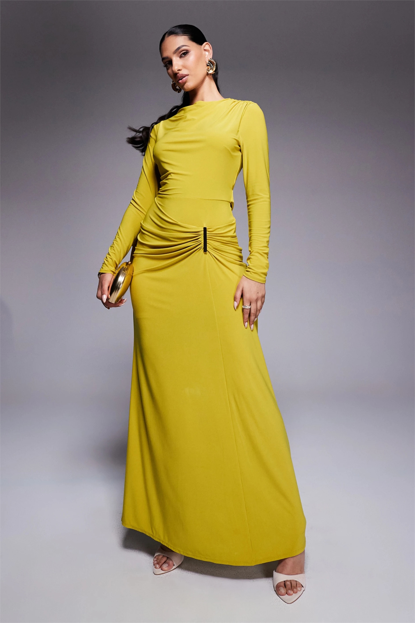 Макси-платье с длинными рукавами, драпировкой, сборками на юбке и отделкой