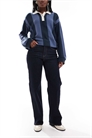 Джинсовая ткань без эластана: оттенок средне-синий. Основной состав: 98% хлопок, 2% эластан.