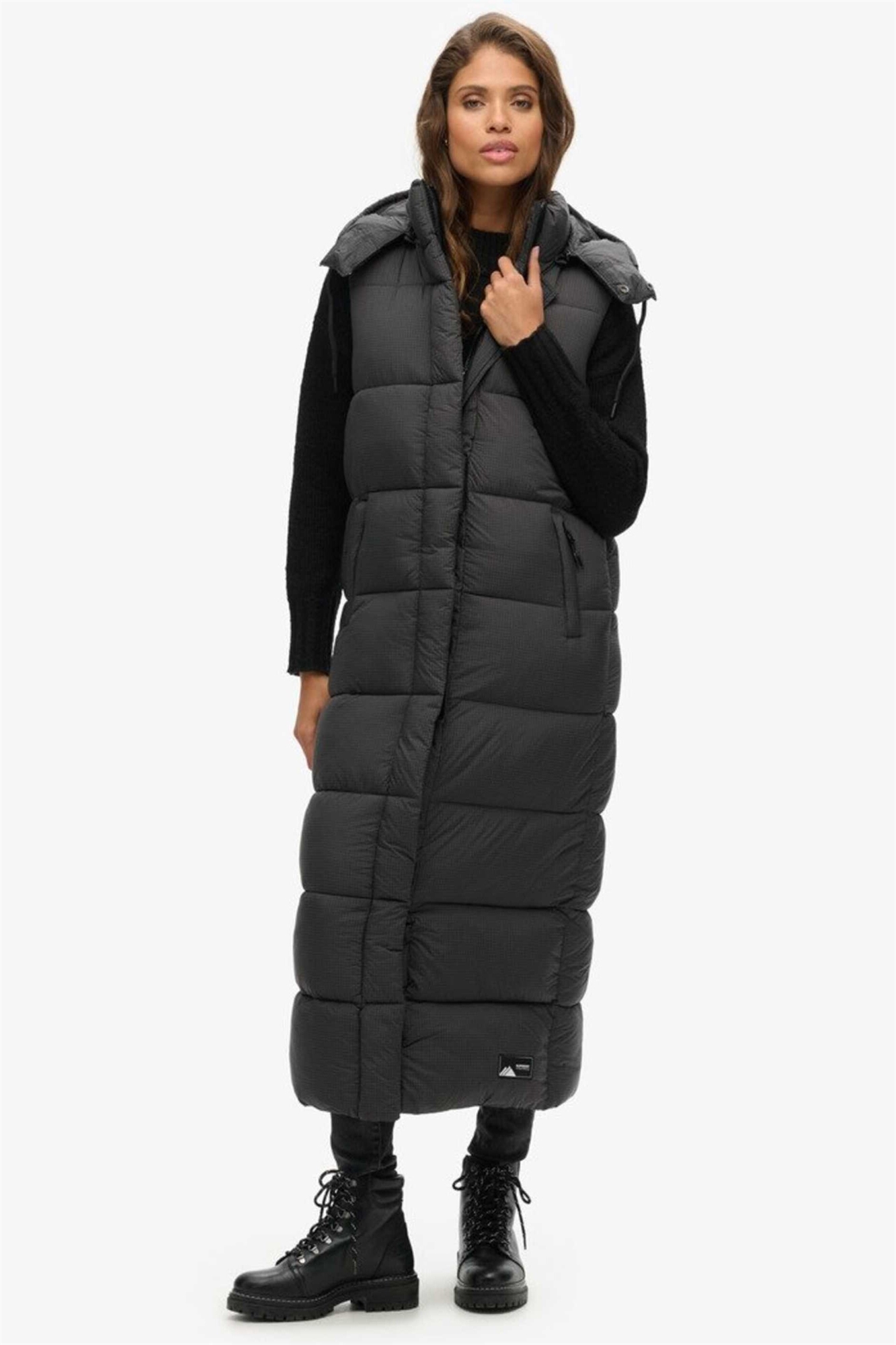 Длинный жилет с капюшоном из рипстопа черного цвета с сеткой