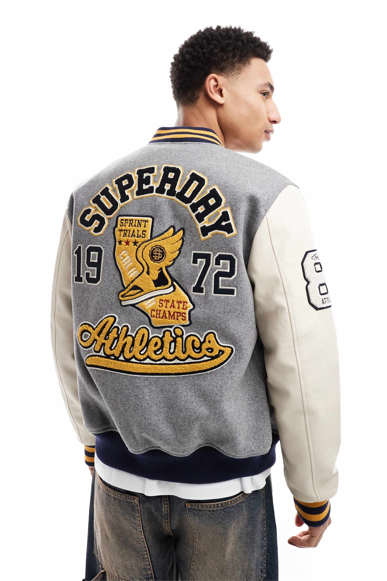 Колледжная бомбер-куртка с нашивками, серого цвета