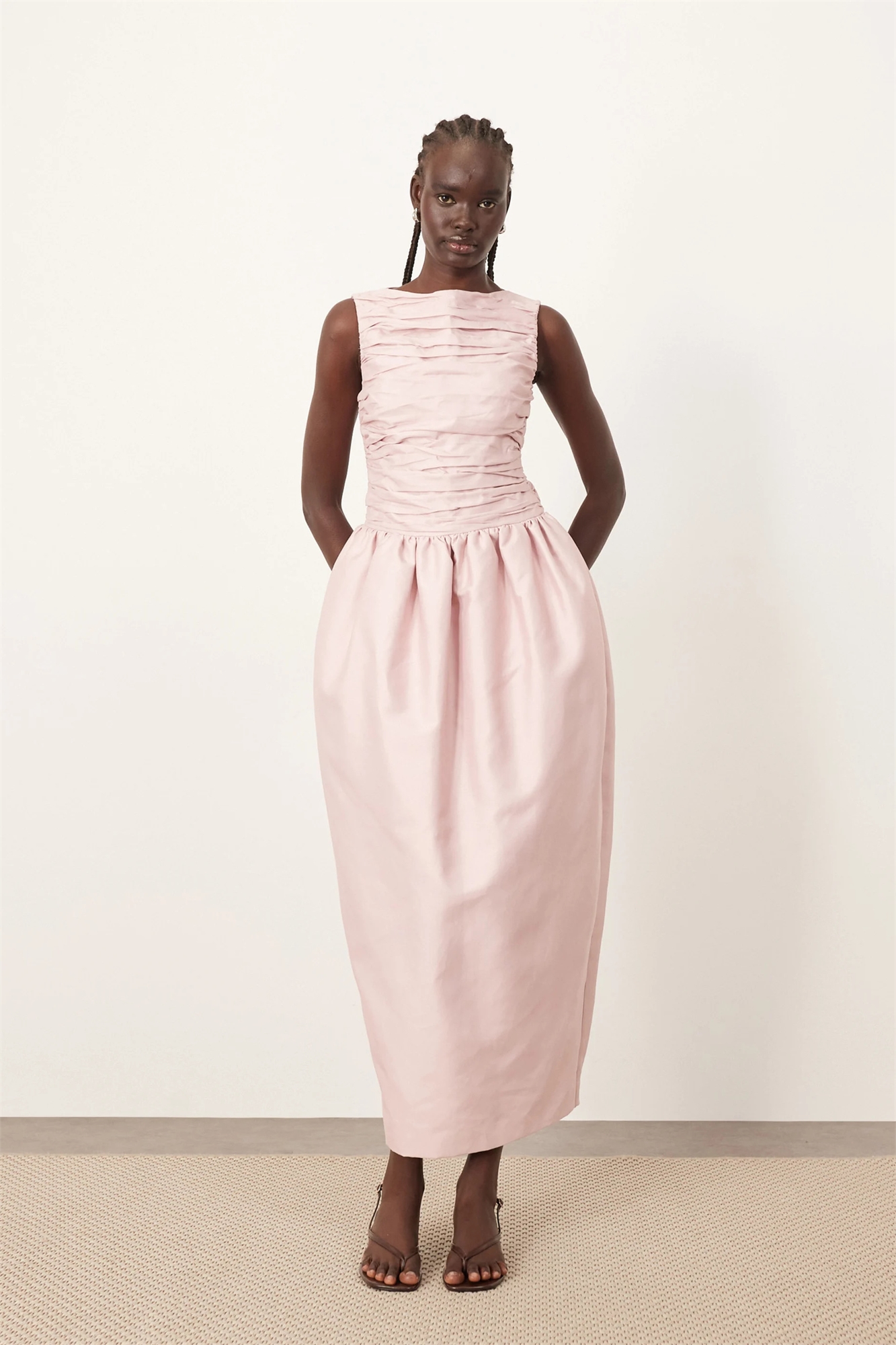 Ткань сатинового типа: блестящая, хорошо драпируемая и шелковисто-гладкая. Подкладка: 96% полиэстер, 4% эластан; сетка: 100% полиэстер; верх: 54% хлопок, 46% полиэстер.
