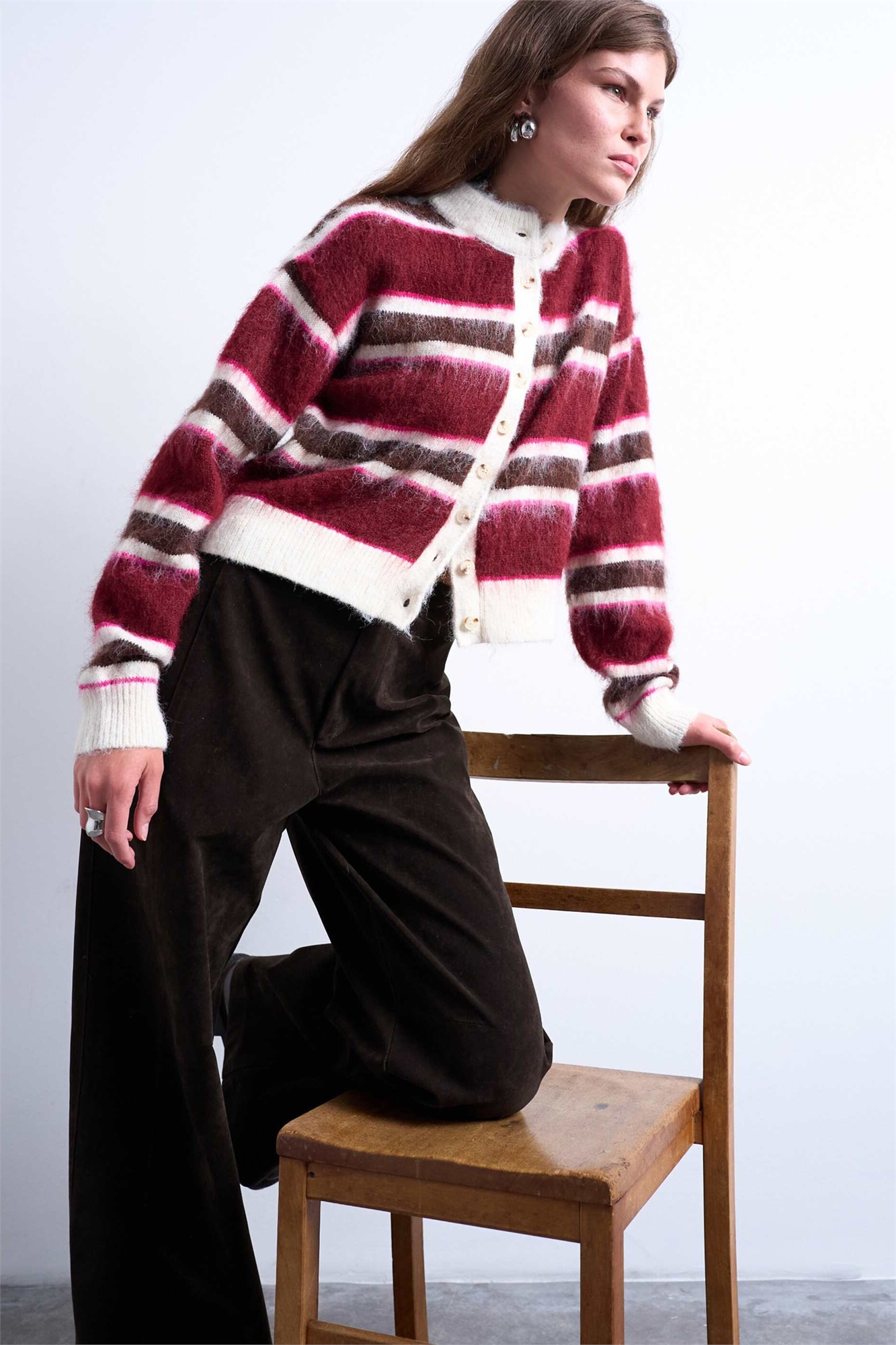 Вязаный пушистый кардиган в полоску