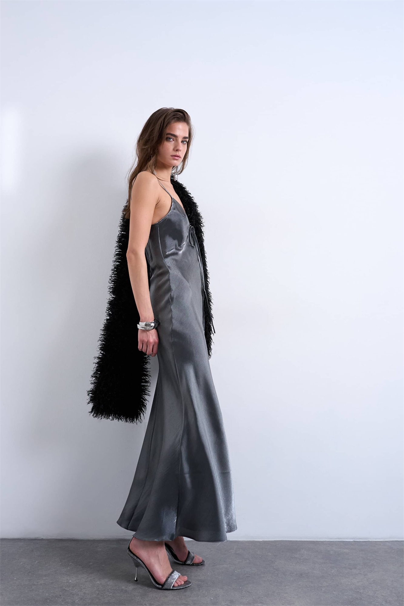 Макси-платье-комбинация с завязками на шее и эффектом жидкого металла