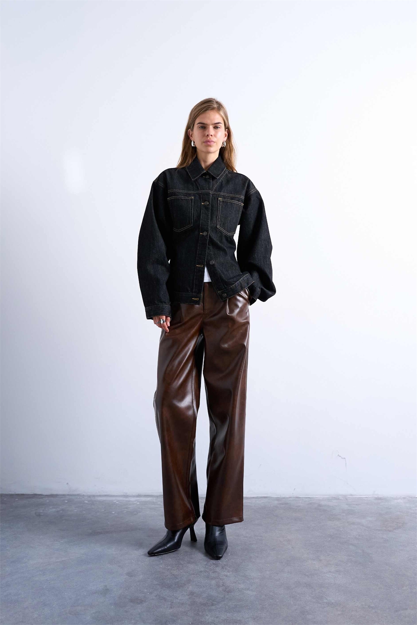 Брюки из искусственной кожи с прямыми брючинами и плиссировкой