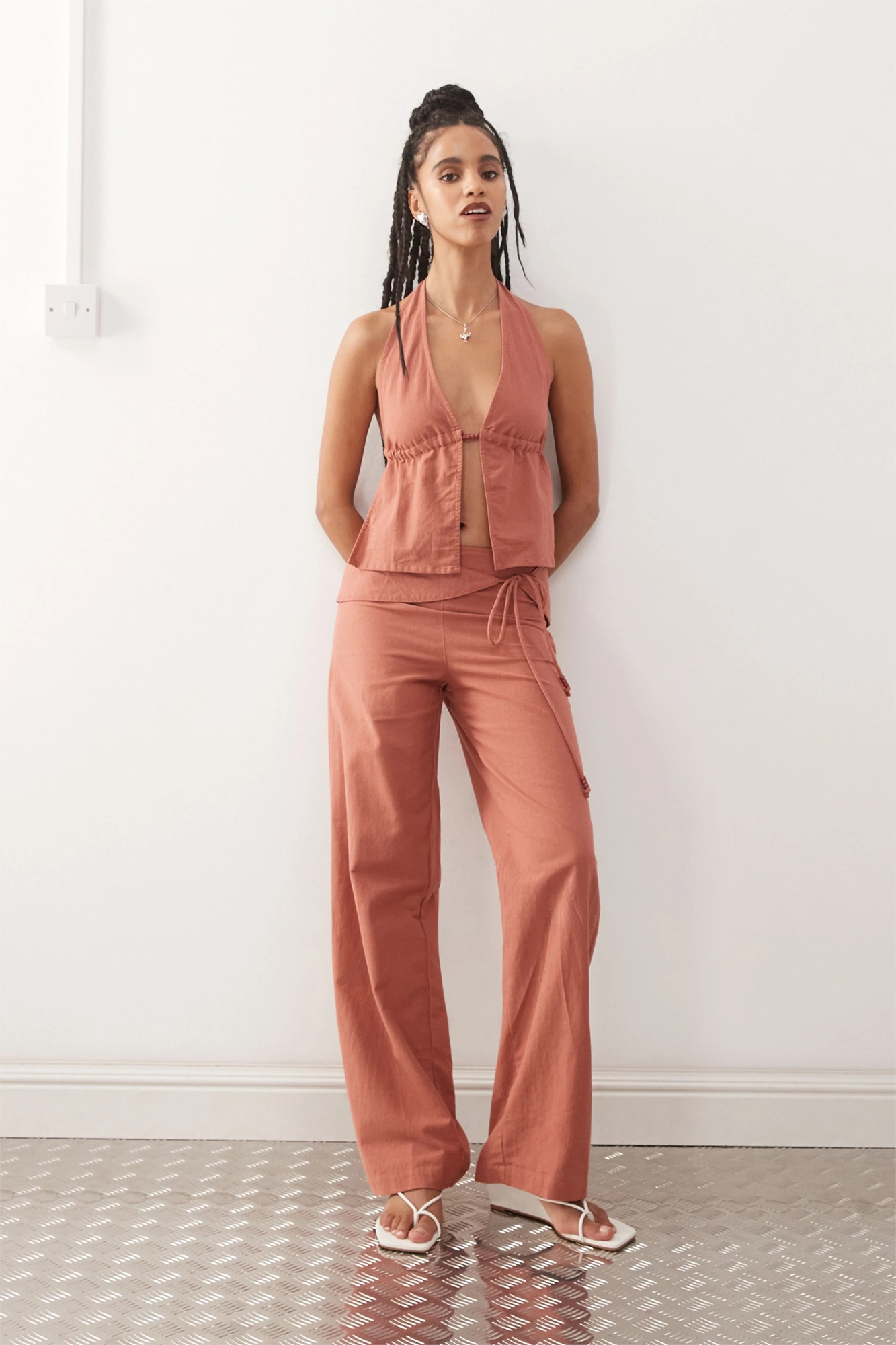 Брюки из льна с накидкой в стиле саронг и бисерной отделкой