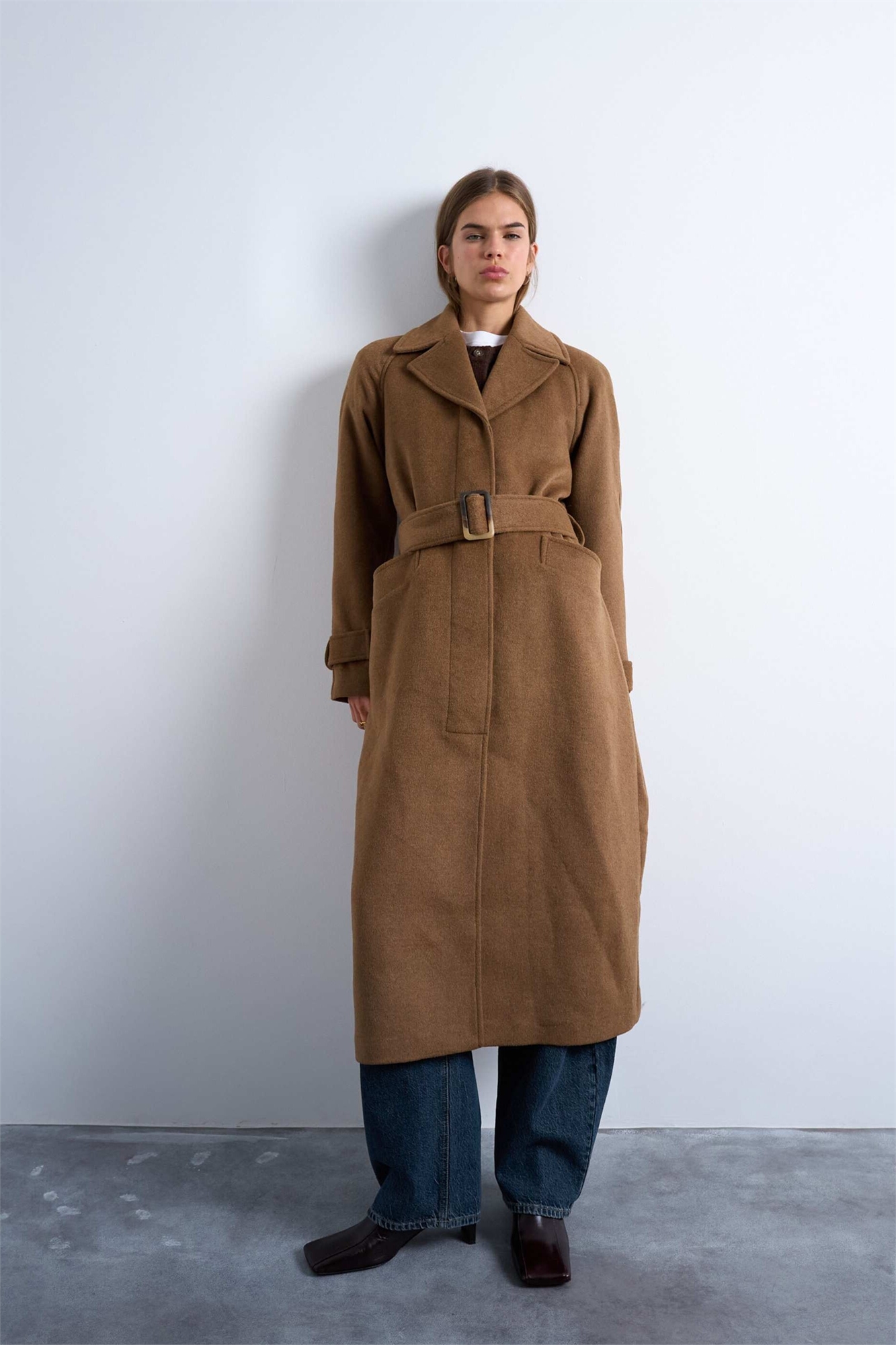 Длинное пальто с поясом из шерсти