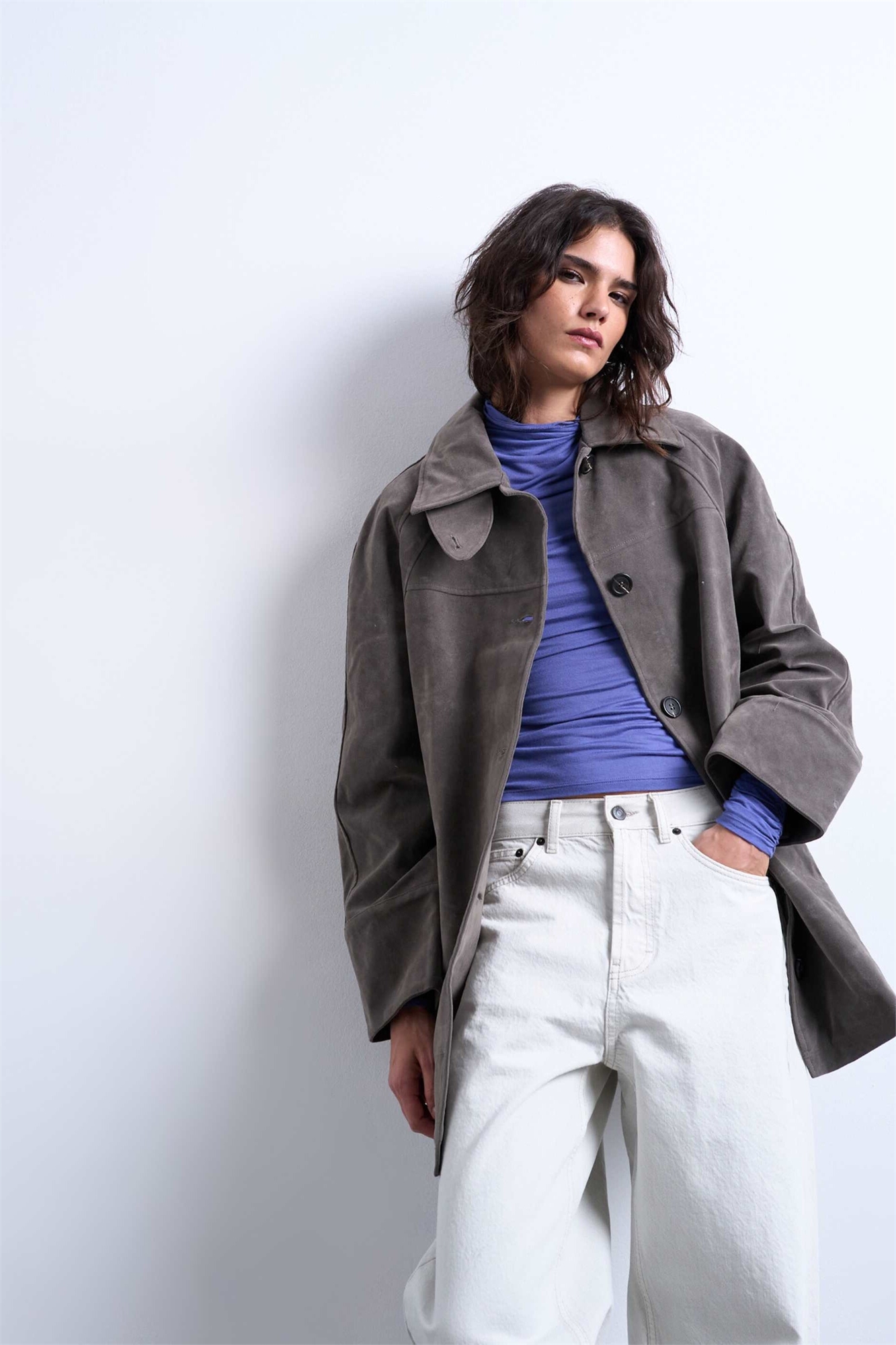 Короткий пальто-кардиган из искусственной замши с воротником-воронкой и застежкой на шее