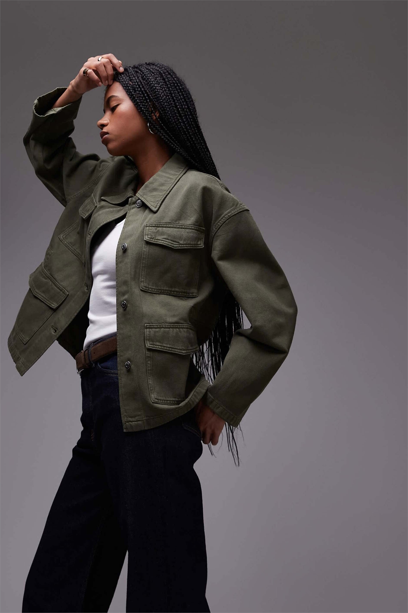 Джинсовая куртка с накладными карманами и затягивающимся поясом сзади