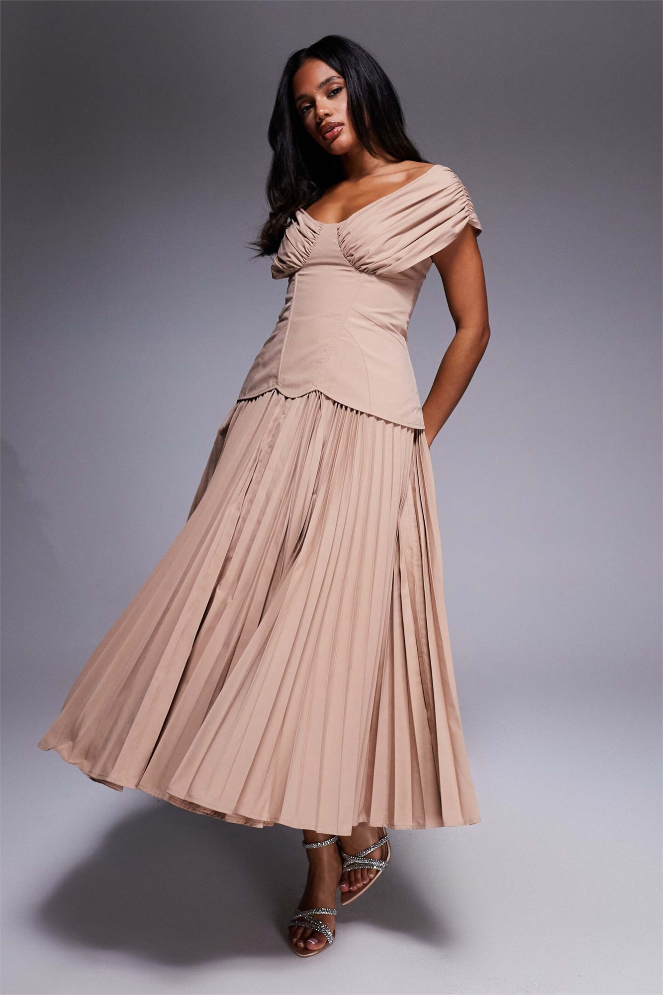 Платье средней длины с открытыми плечами, плиссированное, с формованными бедрами