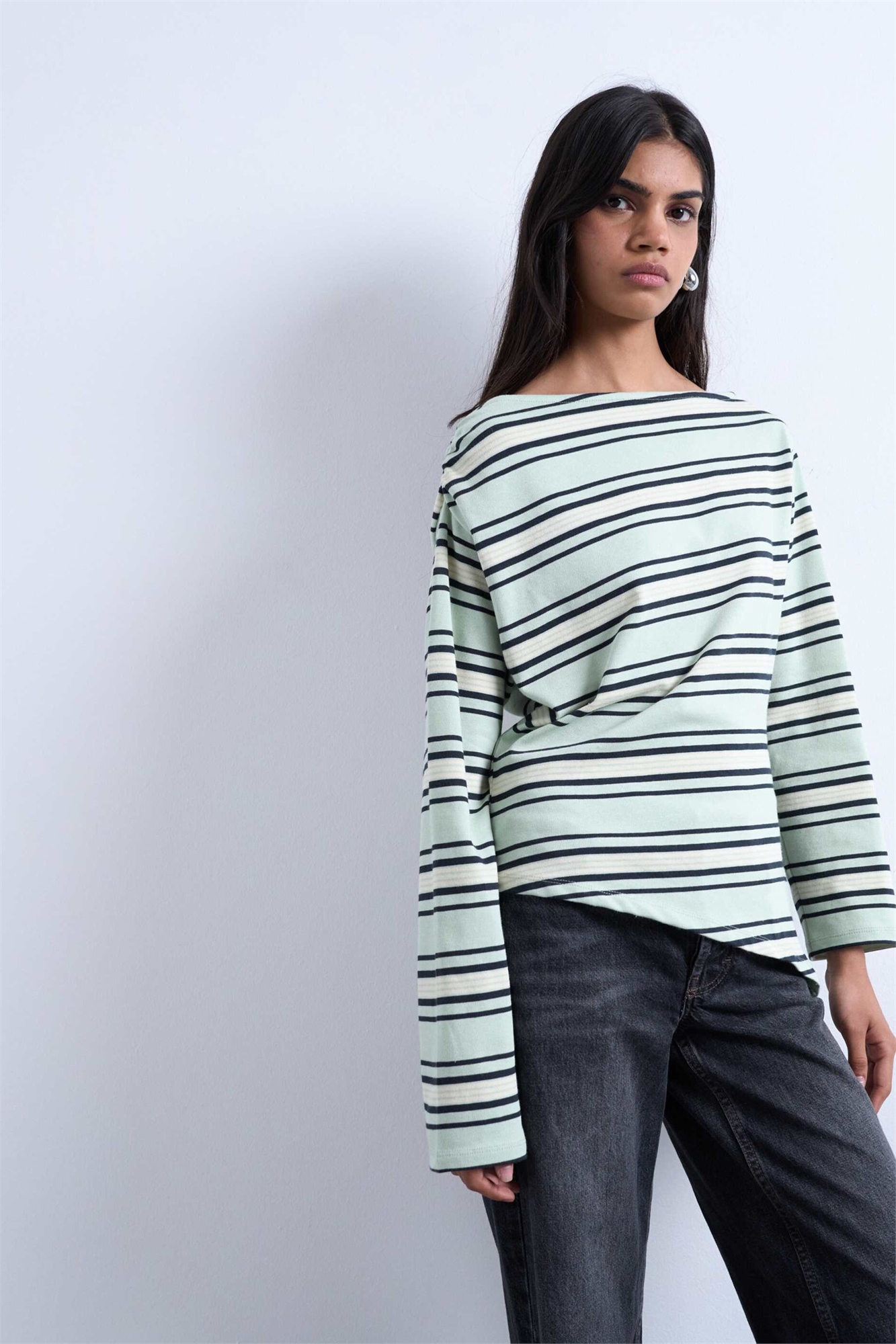 Топ с длинными рукавами и асимметричным вырезом в полоску