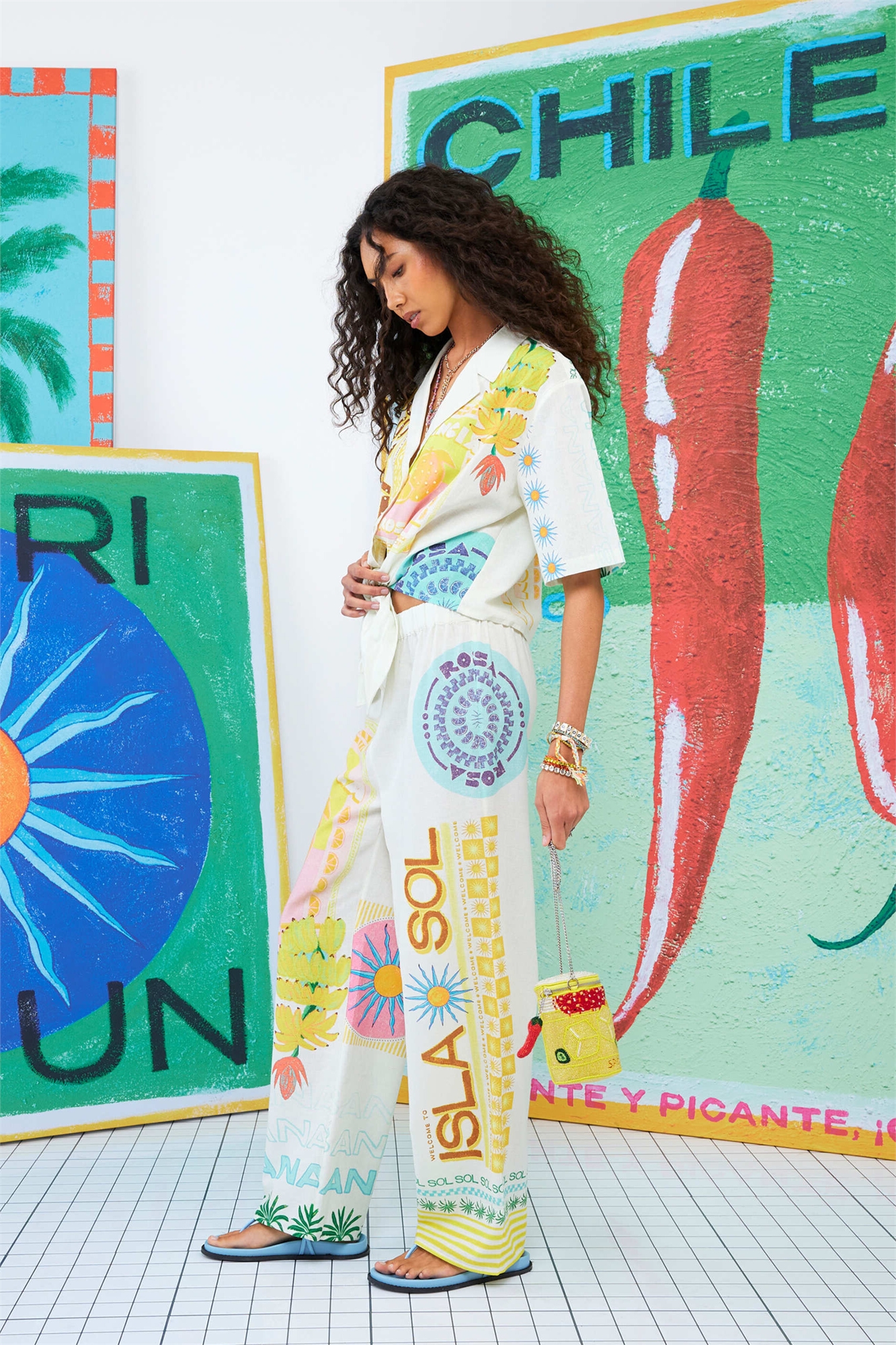 Брюки из льна с графическим принтом ATLAS кремового цвета
