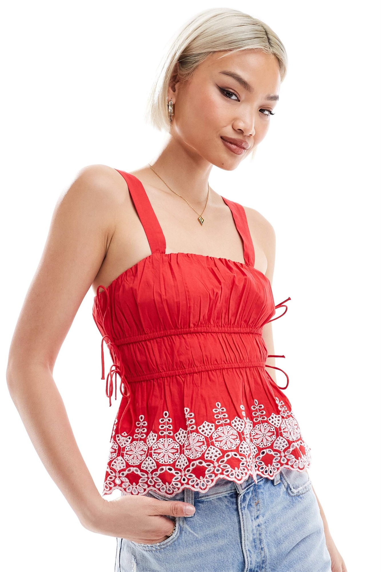 Топ на бретельках с вышитым подолом