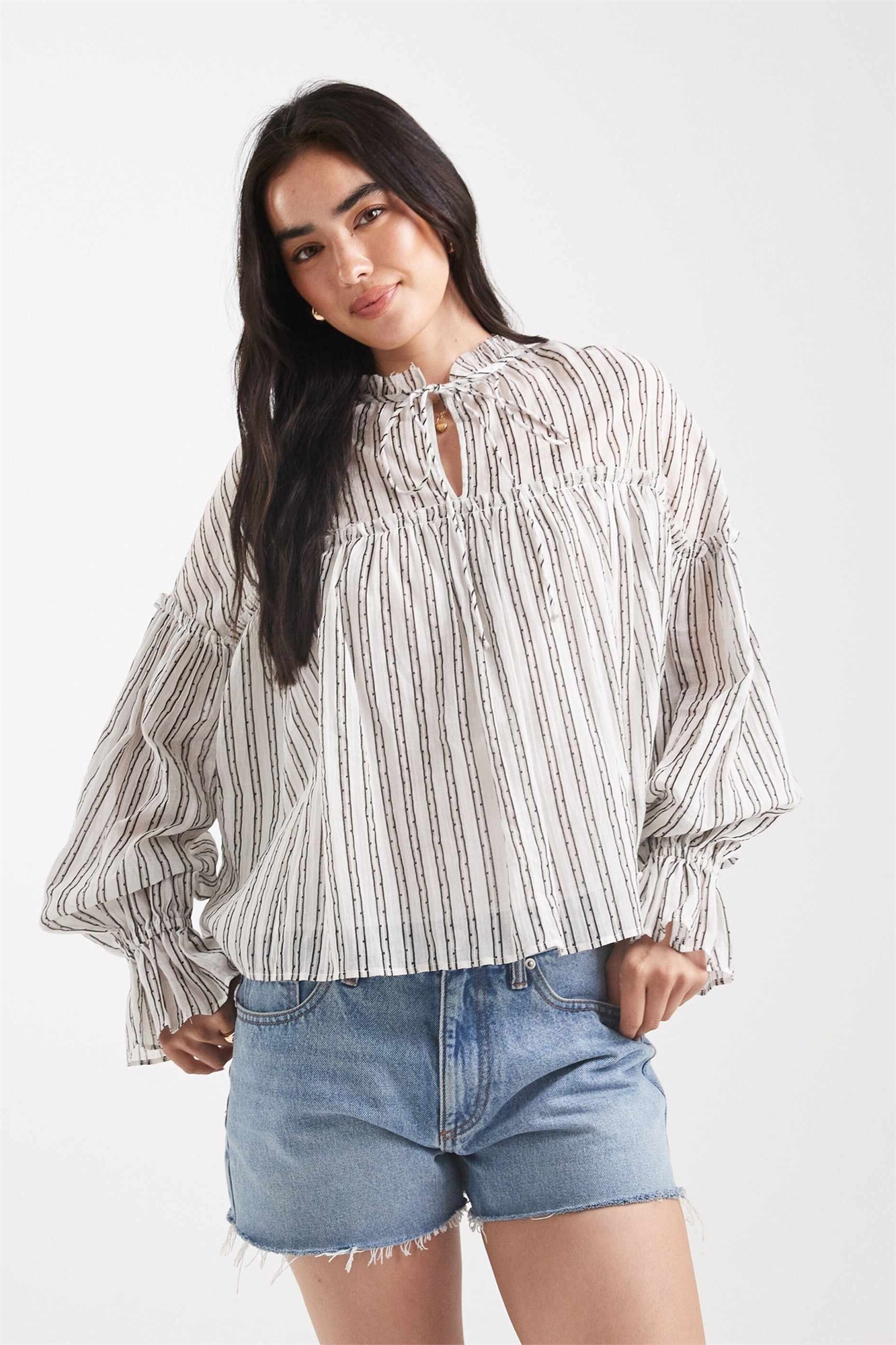 Блузка с завязками на шее, рюшами и гофрированной тканью, с длинными рукавами