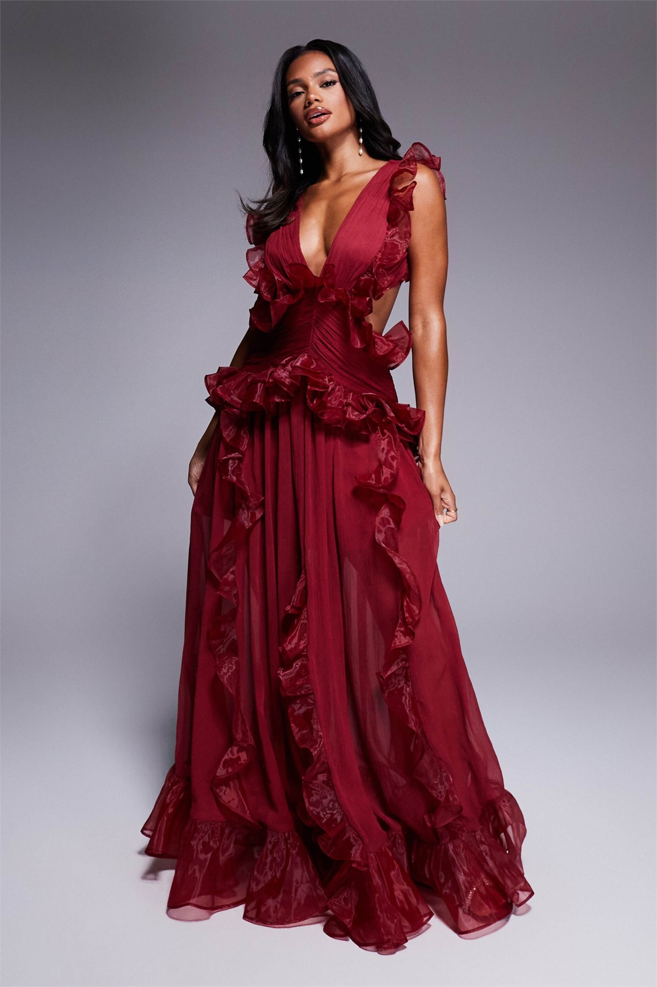 Макси-платье с глубоким вырезом, рюшами из шифона и открытой спиной