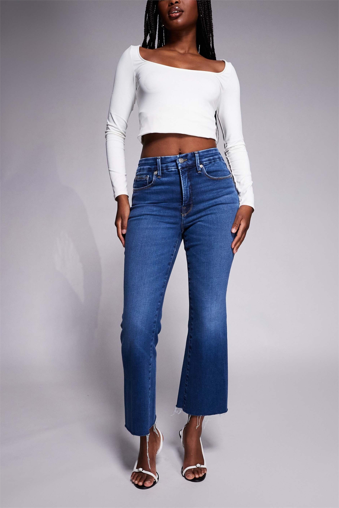 Джинсы-ботинки с мягкой тканью и красивыми брючинами, укороченной длиной