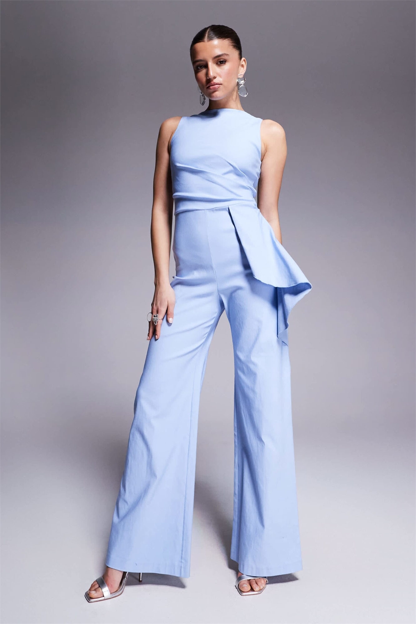 Комбинезон из бенгалина с высоким воротником, драпировкой по бокам и широкими брючинами