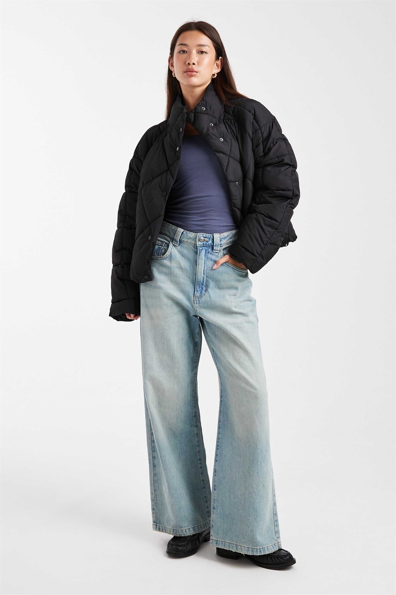 Увеличенная стеганая куртка-пуховик с воротником-воронкой черного цвета