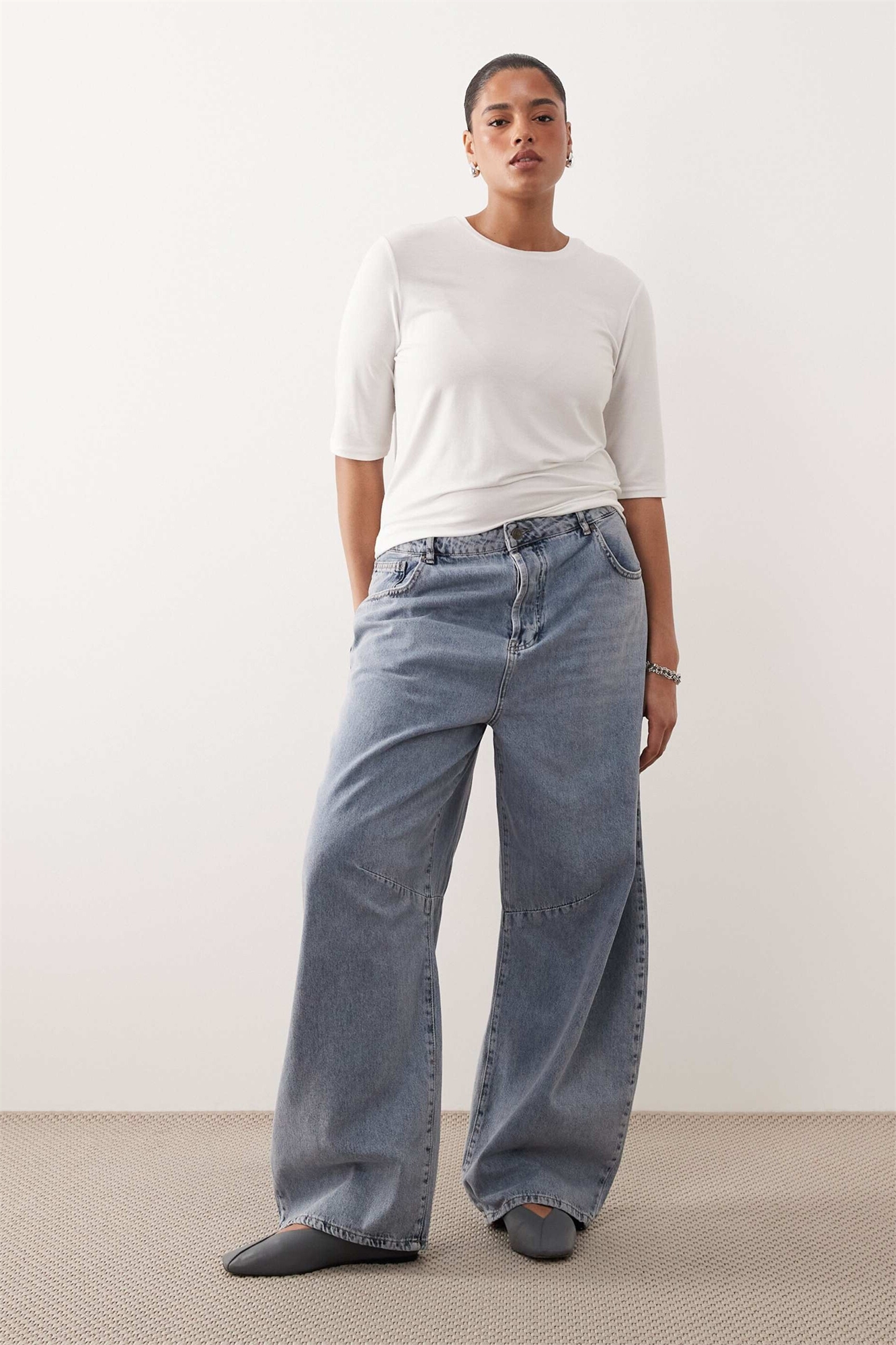 Тяжелый, неэластичный деним: светло-голубой оттенок Основной материал: 100% хлопок.